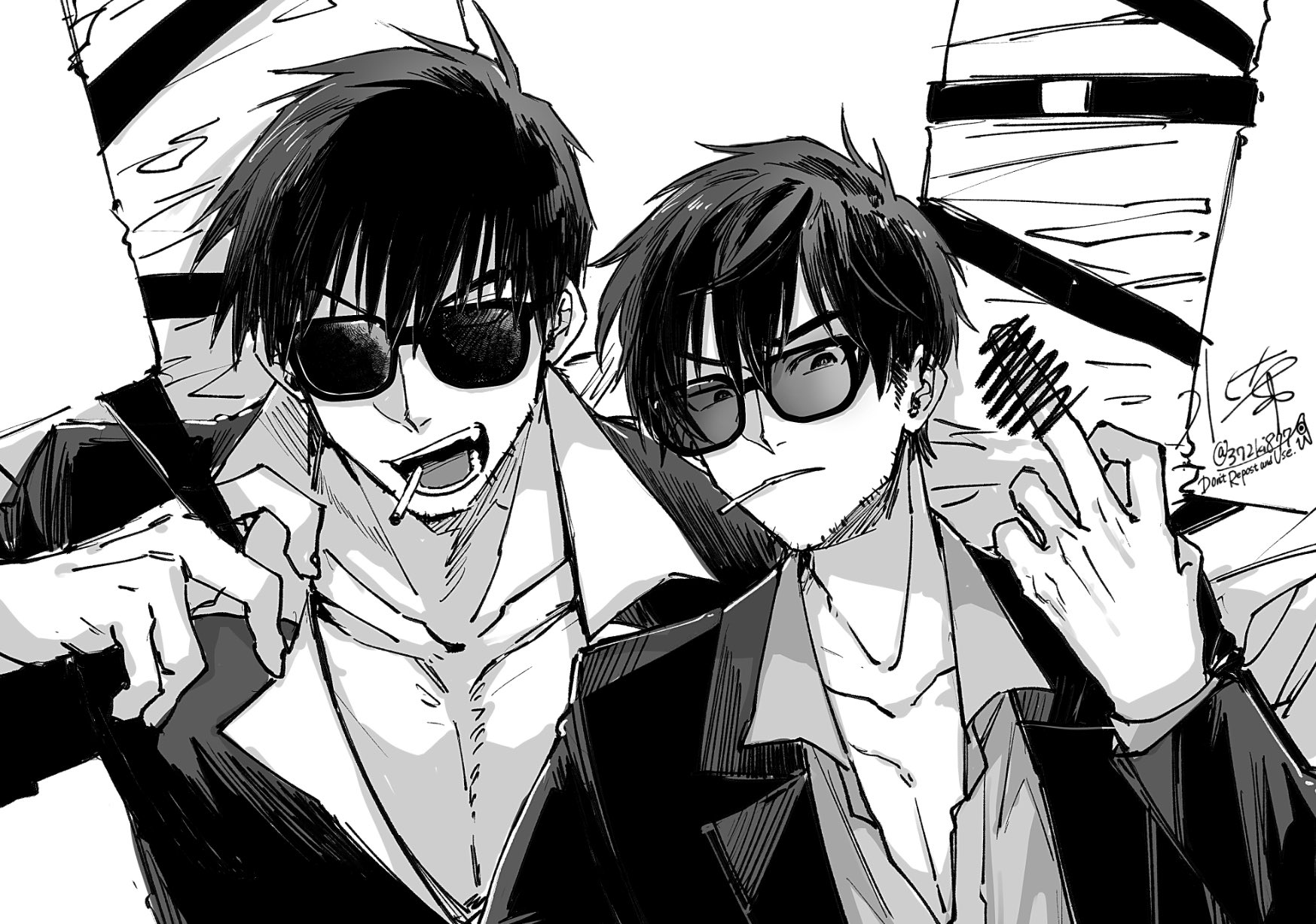 2boys cigarette collared_shirt cross facial_hair glasses hand_up highres jacket male_focus middle_finger mizuki7810 monochrome mouth_hold multiple_boys nicholas_d._wolfwood open_mouth partially_unbuttoned shirt short_hair sunglasses trigun trigun_stampede upper_body v-shaped_eyebrows