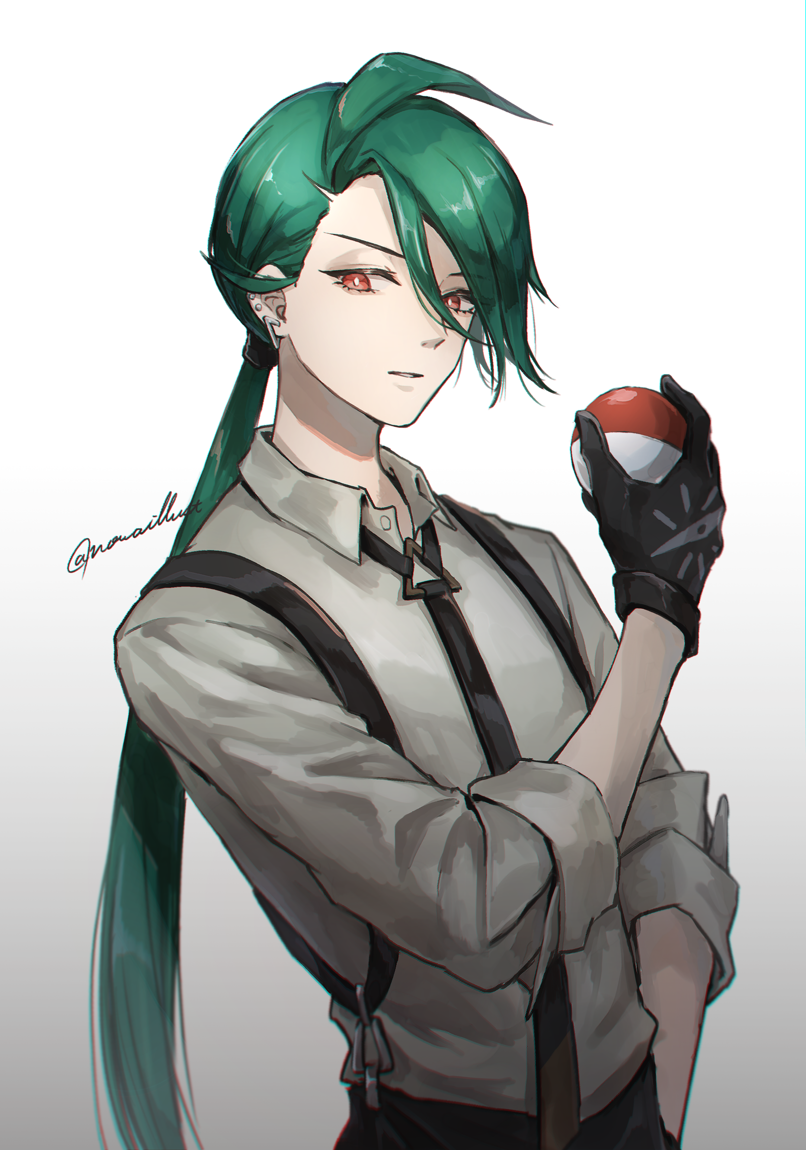 1girl absurdres androgynous black_gloves black_necktie bright_pupils collared_shirt commentary earrings gloves gradient_background green_hair hand_on_own_hip hand_up highres holding holding_poke_ball jewelry long_hair looking_down necktie nintendo noraillust orange_eyes parted_lips poke_ball poke_ball_(basic) pokemon pokemon_scarlet_and_violet ponytail rika_(pokemon) shirt solo stud_earrings suspenders white_pupils