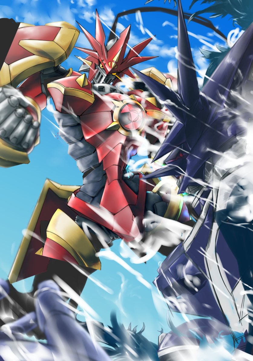 armor chaosdukemon digimon digimon_(creature) digital_hazard dukemon dukemon_chaos_mode dukemon_crimson_mode looking_at_another yellow_eyes