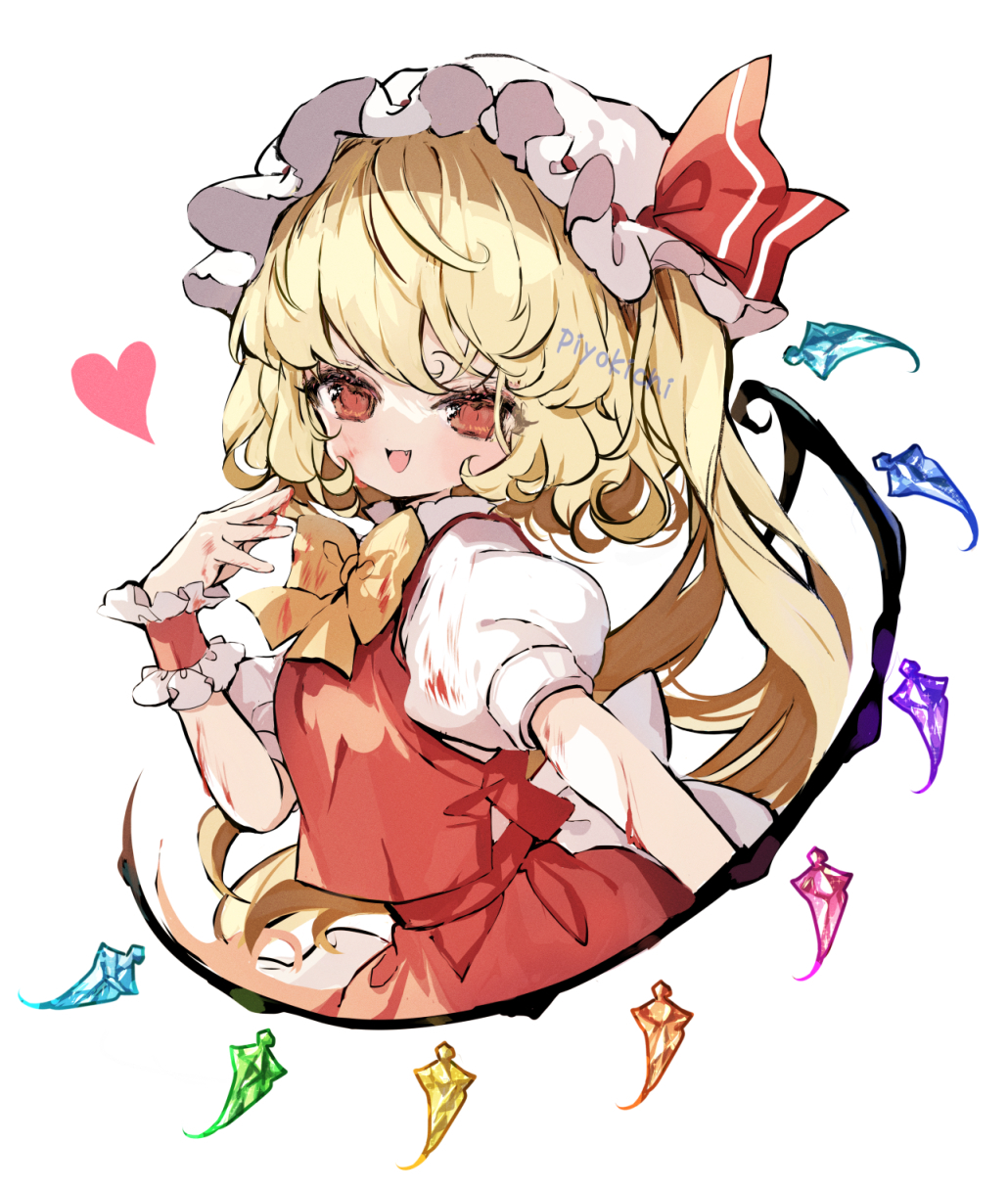 1girl artist_name blonde_hair blood blood_on_clothes blood_on_hands bow crystal_wings flandre_scarlet hat hat_bow heart highres mob_cap open_mouth piyokichi red_bow red_eyes side_ponytail smile touhou wings yellow_bow