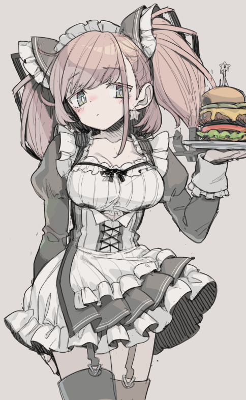 1girl alternate_costume atlanta_(kancolle) black_dress black_thighhighs blush brown_hair burger closed_mouth cowboy_shot dress earrings enmaided food frilled_dress frills garter_straps grey_background grey_eyes holding jewelry kantai_collection long_hair long_sleeves maid maid_headdress monaka_ooji simple_background single_earring solo star_(symbol) star_earrings thighhighs two_side_up