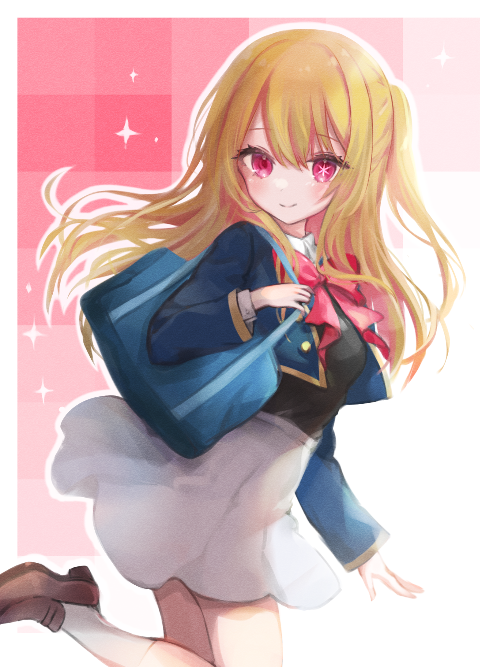 1girl 27vel bag black_vest blonde_hair blue_jacket blush border bow bowtie brown_footwear closed_mouth collared_shirt commentary cropped_jacket grey_skirt highres hoshino_ruby jacket long_hair long_sleeves mismatched_pupils one_side_up oshi_no_ko outline pink_bow pink_bowtie pink_eyes school_bag school_uniform shirt shoulder_bag sidelocks skirt socks solo sparkle star-shaped_pupils star_(symbol) swept_bangs symbol-shaped_pupils vest white_border white_outline white_shirt white_socks youtou_high_school_uniform