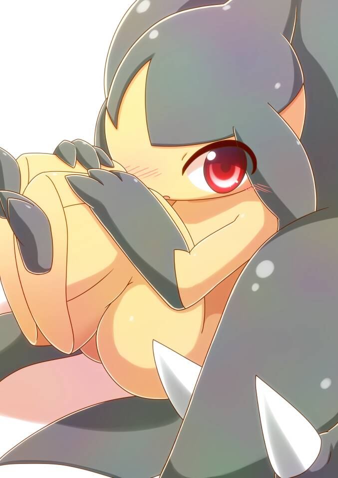 blush commentary_request curled_up dusk_poke27 from_side gen_3_pokemon looking_at_viewer mawile nintendo no_humans parted_lips pokemon pokemon_(creature) red_eyes shy solo white_background