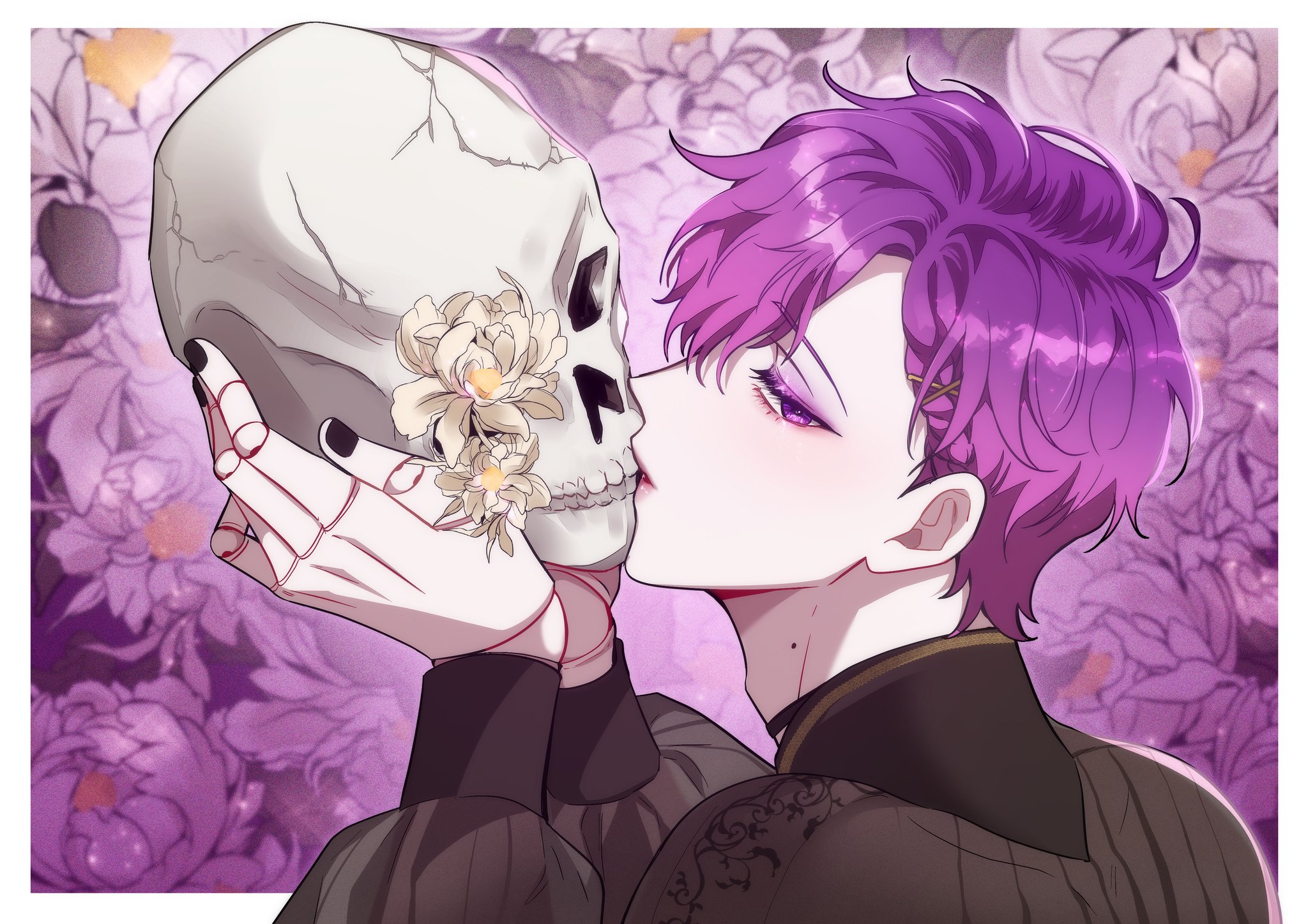 1boy alternate_hairstyle black_nails black_shirt border braid commentary doll_joints eyelashes eyeshadow fingernails floral_background flower gradient_hair hair_between_eyes hair_ornament hands_up highres holding holding_skull joints kiss kissing_skull long_sleeves looking_at_viewer makeup male_focus mole mole_on_neck multicolored_hair nail_polish nijisanji nijisanji_en outside_border parted_bangs parted_lips pink_hair profile puffy_sleeves purple_background purple_eyes purple_eyeshadow purple_flower purple_hair purple_theme shirt short_hair sideways_glance skull solo untranslatable_commentary turtleneck uki_violeta upper_body virtual_youtuber white_border white_flower x_hair_ornament yoy_(0yyoyy0)