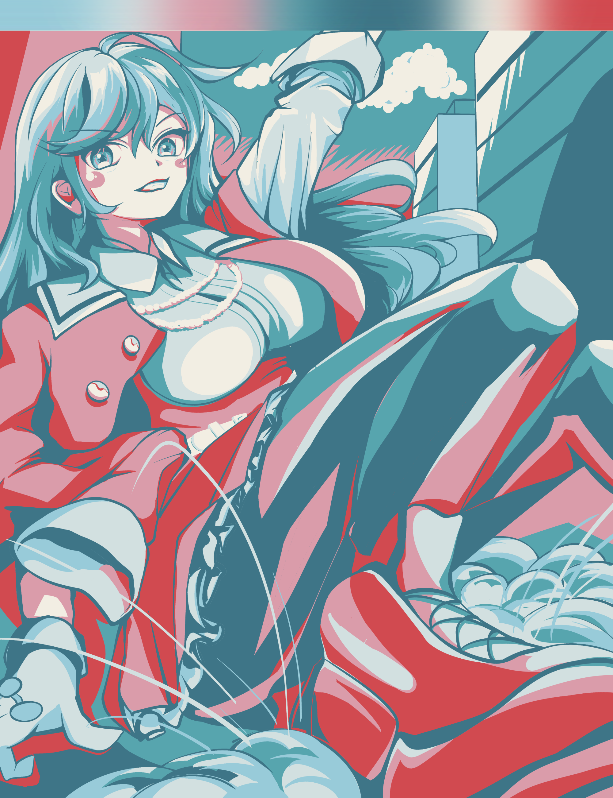 1girl absurdres ahoge aqua_eyes aqua_hair aqua_pantyhose aqua_sky arm_at_side arm_up assault_lily blush breasts buttons cloud collared_shirt color_guide commentary_request day floating_hair foot_out_of_frame frilled_skirt frills gloves grey_gloves grey_shirt grin hair_between_eyes high-waist_skirt highres jacket jacket_on_shoulders knees_up limited_palette long_hair looking_at_viewer medium_breasts miwada_rito nifu_(nixets) on_ground open_clothes open_jacket outdoors outstretched_arm pantyhose red_jacket red_shoes red_skirt school_uniform shirt shoes sitting skirt smile sneakers solo v-shaped_eyebrows