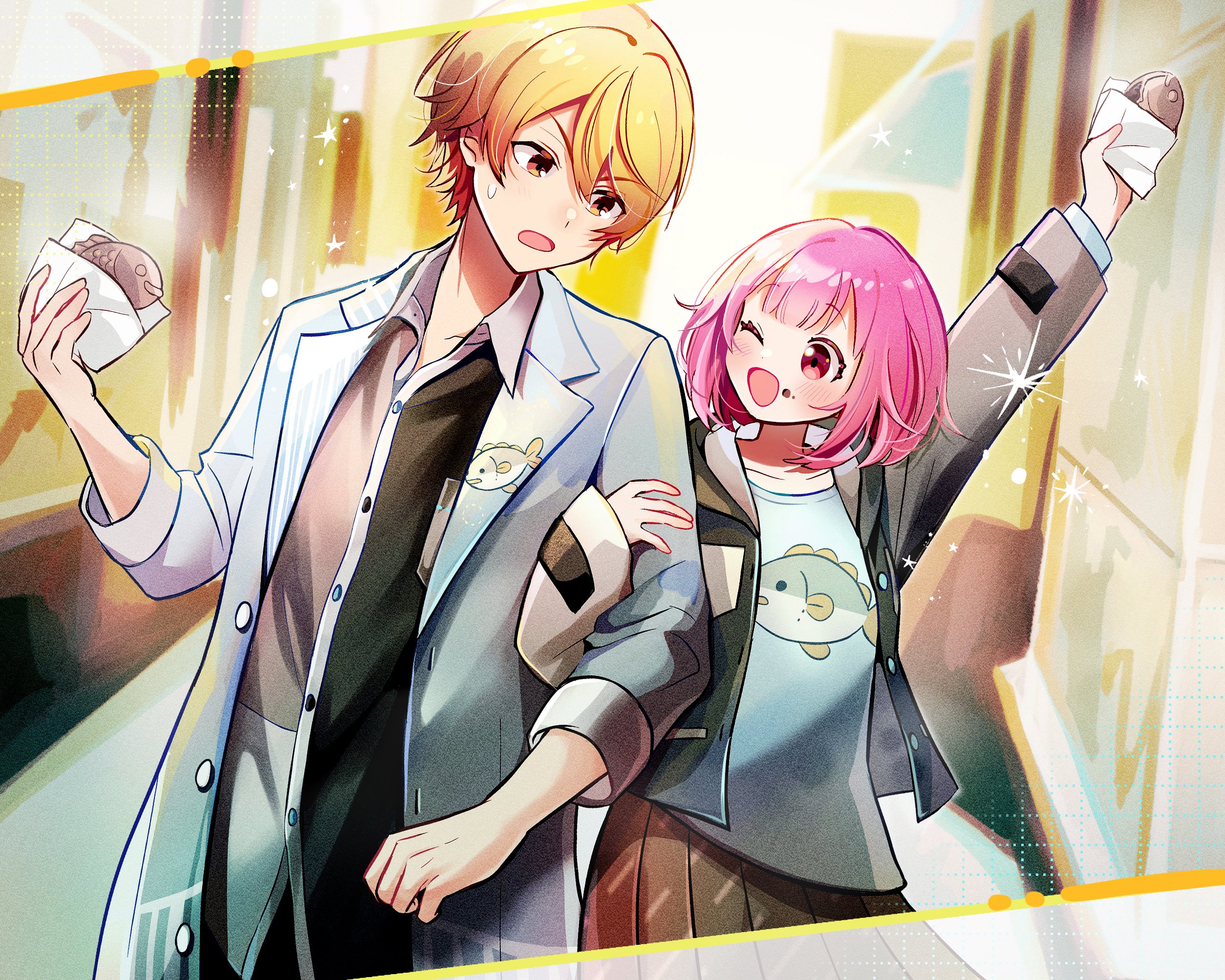 1boy 1girl alternate_costume arm_up blonde_hair blunt_bangs bob_cut buttons collared_shirt commentary_request cowboy_shot fish food food_on_face gradient_hair highres holding holding_food hood hood_down jacket lapels locked_arms long_sleeves momomo_(m0_3) multicolored_hair one_eye_closed ootori_emu open_clothes open_jacket open_mouth orange_eyes orange_hair pink_eyes pink_hair project_sekai shirt short_hair skirt tenma_tsukasa
