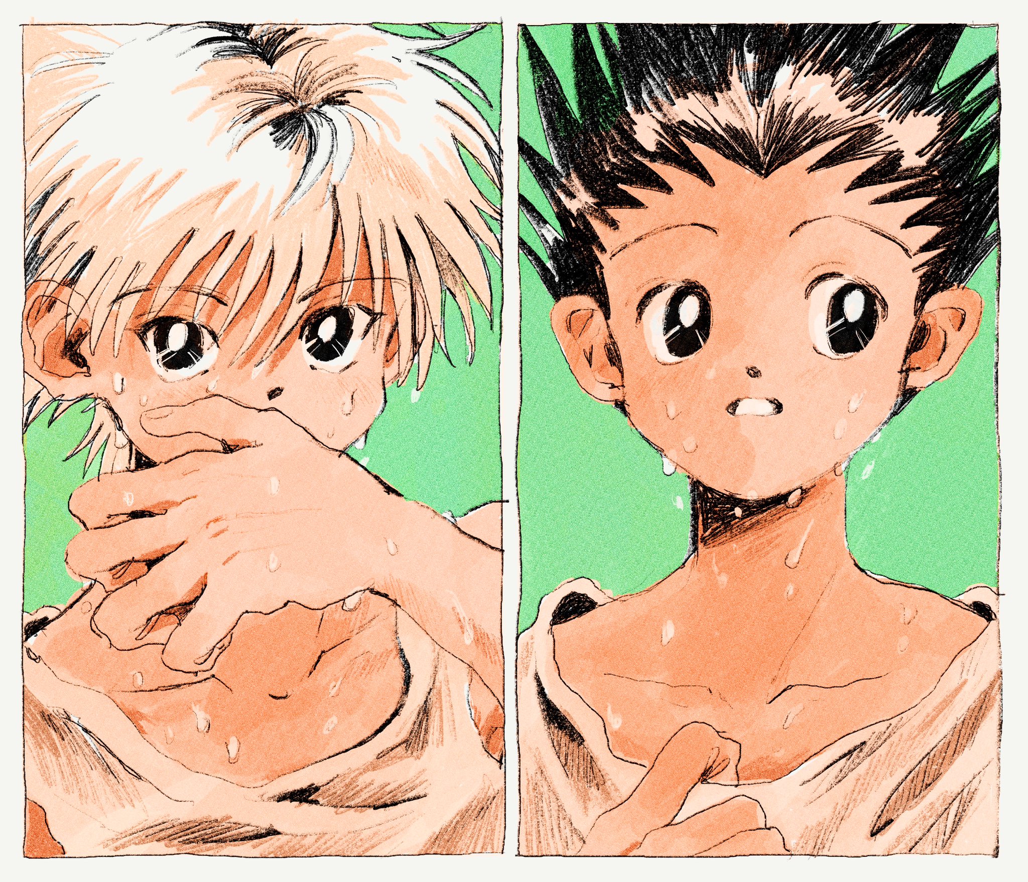 2boys black_eyes black_hair blue_background child gon_freecss highres hunter_x_hunter killua_zoldyck looking_at_viewer looking_to_the_side male_focus multiple_boys shirt short_hair simple_background spiked_hair split_screen toma25252 upper_body wet_face white_hair white_shirt