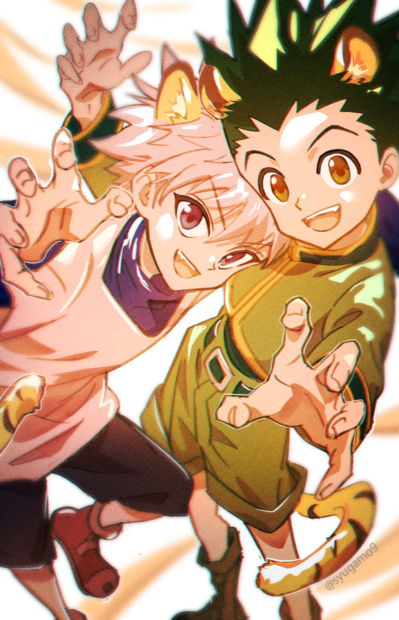 2boys animal_ears artist_name blue_eyes brown_eyes child gon_freecss green_footwear green_hair green_jacket green_shorts hunter_x_hunter jacket killua_zoldyck kuo_tasuku layered_sleeves long_sleeves looking_at_viewer male_focus multiple_boys shirt short_hair short_over_long_sleeves short_sleeves shorts smile spiked_hair tail tiger_ears white_hair white_shirt