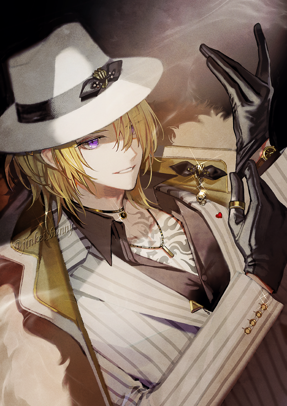 1boy black_choker black_gloves black_shirt blonde_hair bow buttoned_cuffs buttons choker collared_shirt dutch_angle fedora formal_clothes fur-trimmed_jacket fur_trim glint glove_pull gloves grin hair_over_one_eye hat hat_bow highres jacket jacket_on_shoulders jewelry jinkei lapels layered_clothes leather leather_gloves long_bangs looking_at_viewer luca_kaneshiro luca_kaneshiro_(1st_costume) male_focus medium_hair nijisanji nijisanji_en open_clothes open_collar open_jacket open_mouth pendant pendant_choker purple_eyes ring shirt sidelocks smile solo striped_suit suit teeth virtual_youtuber white_hat white_suit