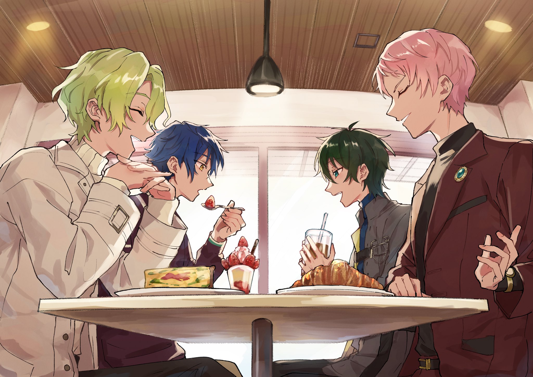 4boys aqua_eyes blue_hair closed_eyes commentary_request croissant dark_blue_hair ensemble_stars! food fork green_hair highres holding holding_fork itsuki_shu kagehira_mika lapels long_sleeves male_focus multiple_boys open_mouth parfait pink_hair plate sazanami_jun short_hair sitting table tomoe_hiyori turtleneck valkyrie_(ensemble_stars!) watch wednesday_108 wristwatch yellow_eyes