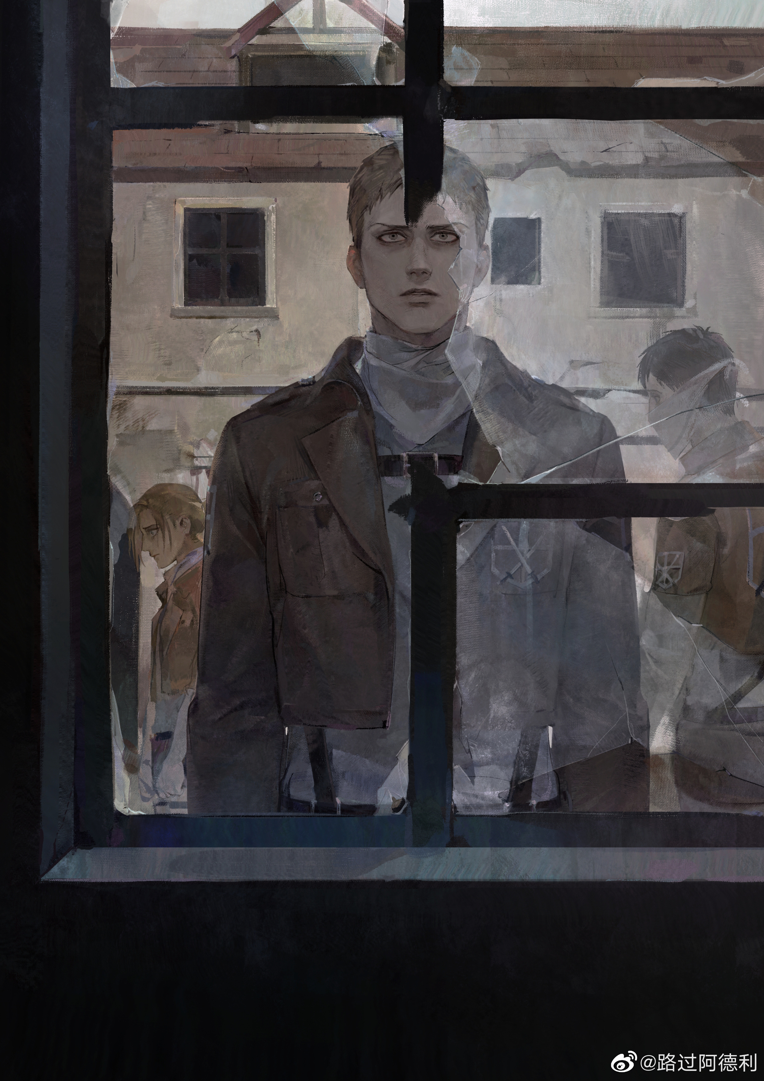 1girl 2boys absurdres annie_leonhart arms_at_sides bertolt_hoover blonde_hair broken_window chest_belt cropped_jacket highres horrified looking_up luguoadeli_(maple12031) male_focus multiple_boys paradis_military_uniform reiner_braun sad shingeki_no_kyojin shirt short_hair solo_focus upper_body wide-eyed