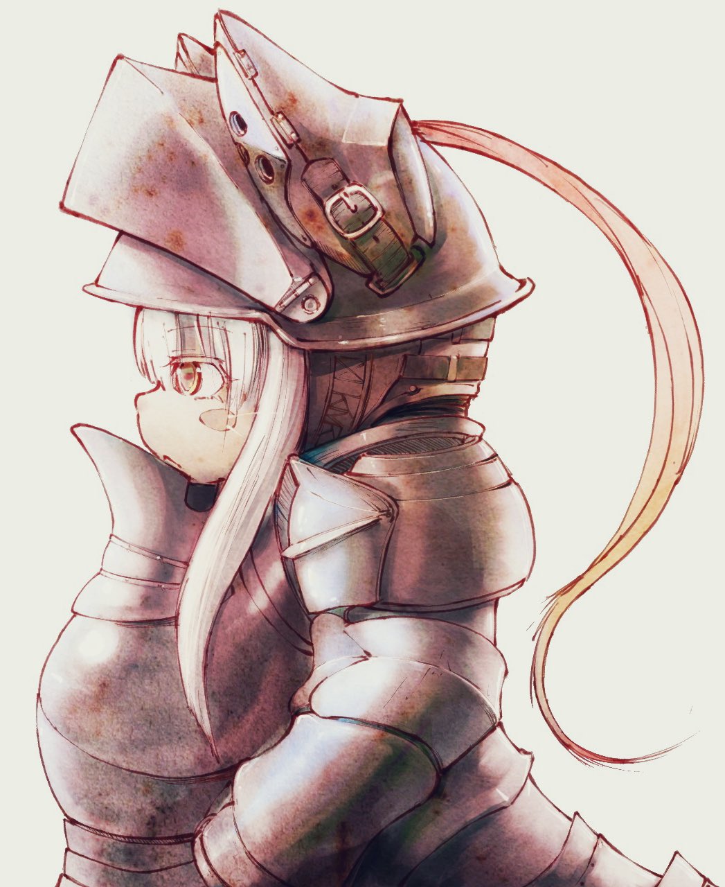 1other armor expressionless from_side furry helmet highres keimura_(ksong) knight made_in_abyss nanachi_(made_in_abyss) other_focus pauldrons plate_armor plume profile shoulder_armor sidelocks simple_background solo whiskers white_background white_hair