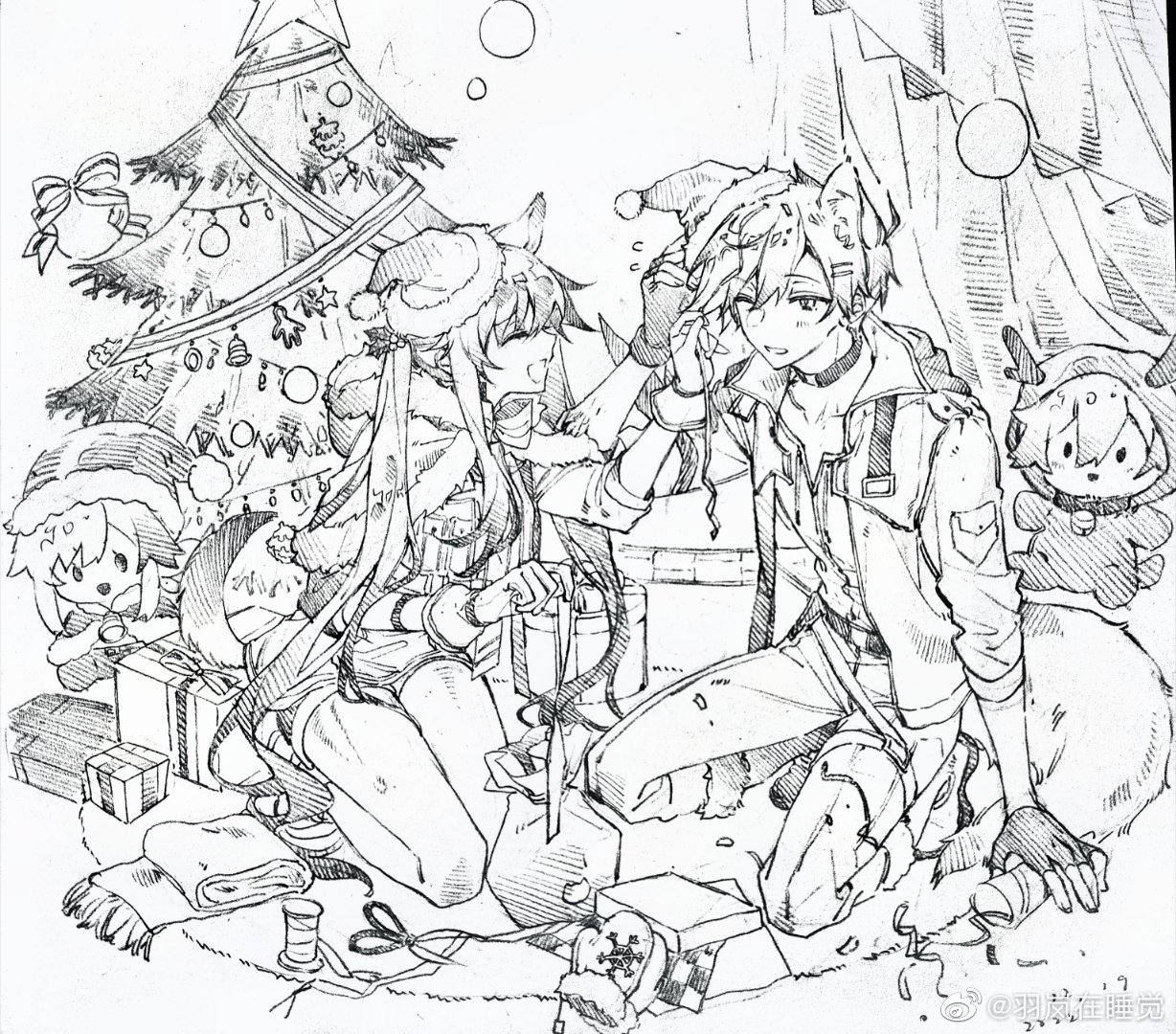 1boy 1girl :d ^_^ arknights arm_support capelet cardigan_(arknights) character_doll character_request choker christmas_tree closed_eyes collarbone doll fingerless_gloves flying_sweatdrops fringe_trim fur-trimmed_capelet fur-trimmed_headwear fur-trimmed_mittens fur_trim gloves greyscale hair_between_eyes hair_ornament hairclip hat hood hood_down hooded_capelet jacket long_hair long_sleeves mini_hat mini_santa_hat mittens monochrome open_clothes open_jacket open_mouth pants pennant photo_(medium) profile santa_hat scarf seiza shirt short_shorts shorts sitting smile steward_(arknights) string_of_flags tilted_headwear traditional_media very_long_hair yu_lan_zai_shuijiao