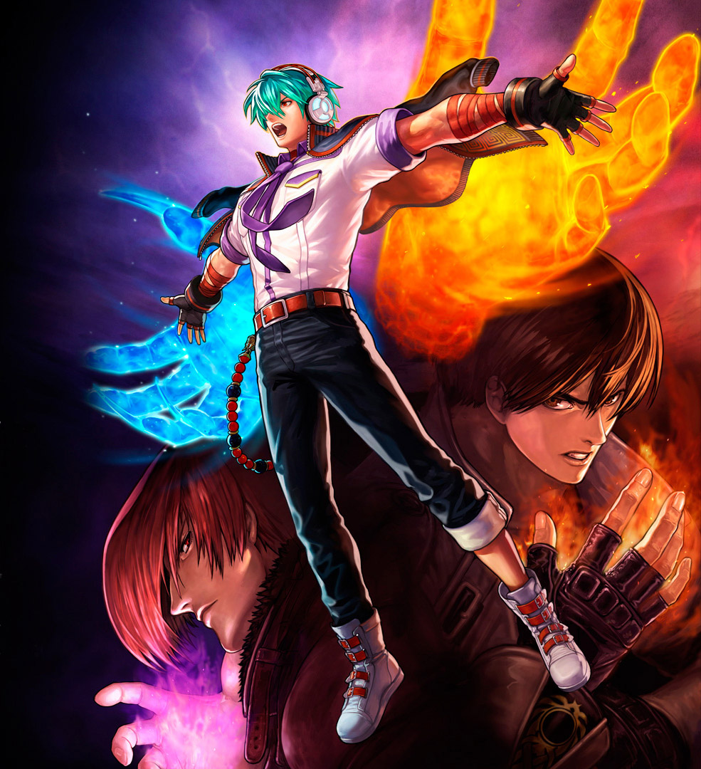 3boys brown_eyes brown_hair fire green_hair headphones kusanagi_kyou male_focus multiple_boys necktie ogura_eisuke purple_fire purple_necktie red_eyes red_hair shun'ei snk the_king_of_fighters the_king_of_fighters_xiv yagami_iori