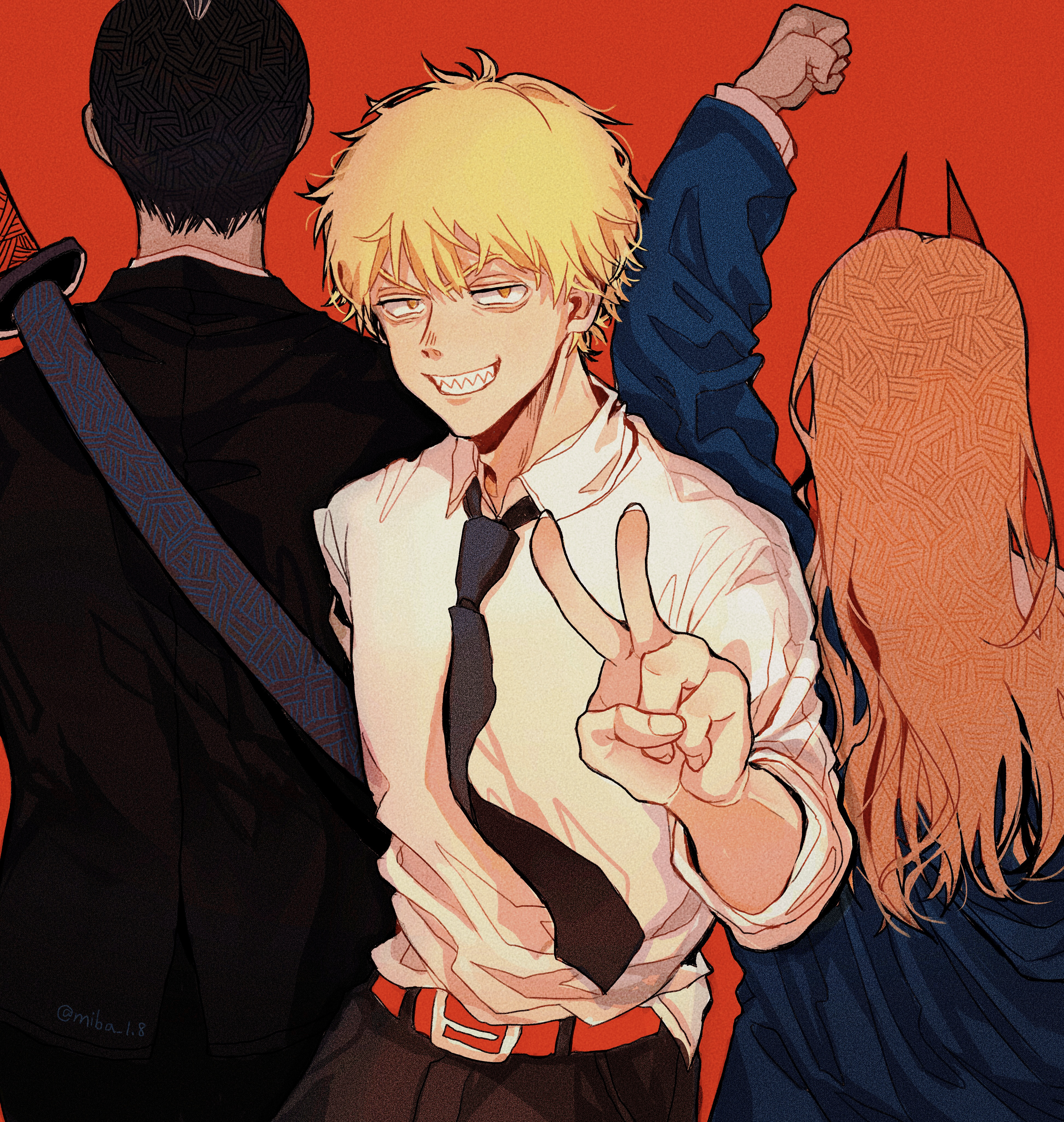 1girl 2boys absurdres arm_up black_hair black_jacket black_necktie black_pants blonde_hair blue_jacket brown_hair chainsaw_man collared_shirt denji_(chainsaw_man) formal_clothes hatching_(texture) hayakawa_aki highres horns jacket katana long_hair looking_at_viewer miba multiple_boys necktie orange_background pants parted_lips power_(chainsaw_man) red_horns sharp_teeth shirt shirt_tucked_in short_hair simple_background smile suit suit_jacket sword teeth twitter_username v weapon weapon_on_back white_shirt yellow_eyes