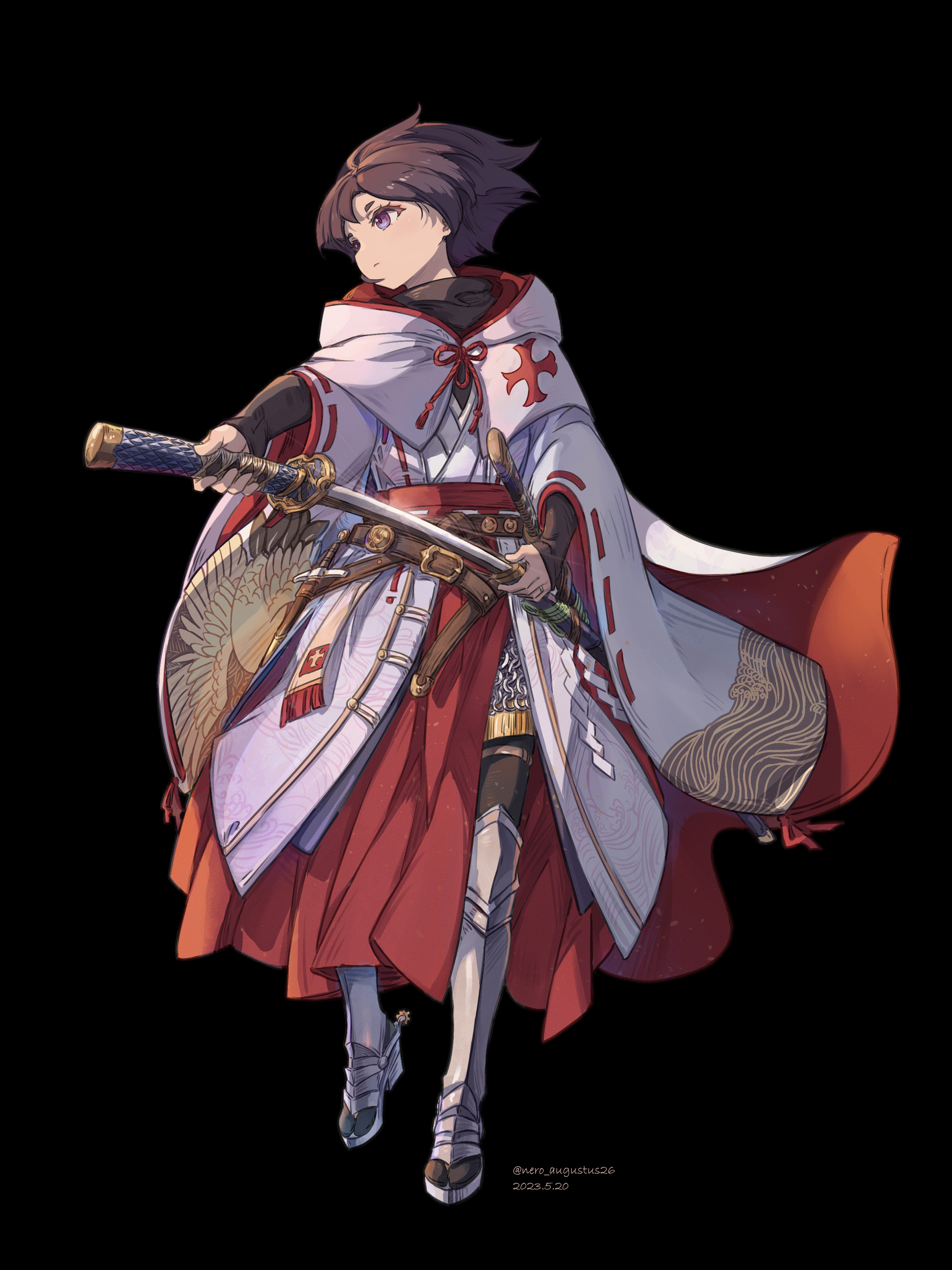 1girl absurdres armor armored_boots belt black_background boots brown_hair chainmail cloak commentary_request cross cross_print dated full_body highres holding holding_sword holding_weapon hood hood_down hooded_cloak japanese_clothes jewelry katana kimono knight nero_augustus nontraditional_miko original purple_eyes ribbon-trimmed_sleeves ribbon_trim ring sheath sheathing shide short_hair solo spurs sword tabi weapon white_kimono wide_sleeves