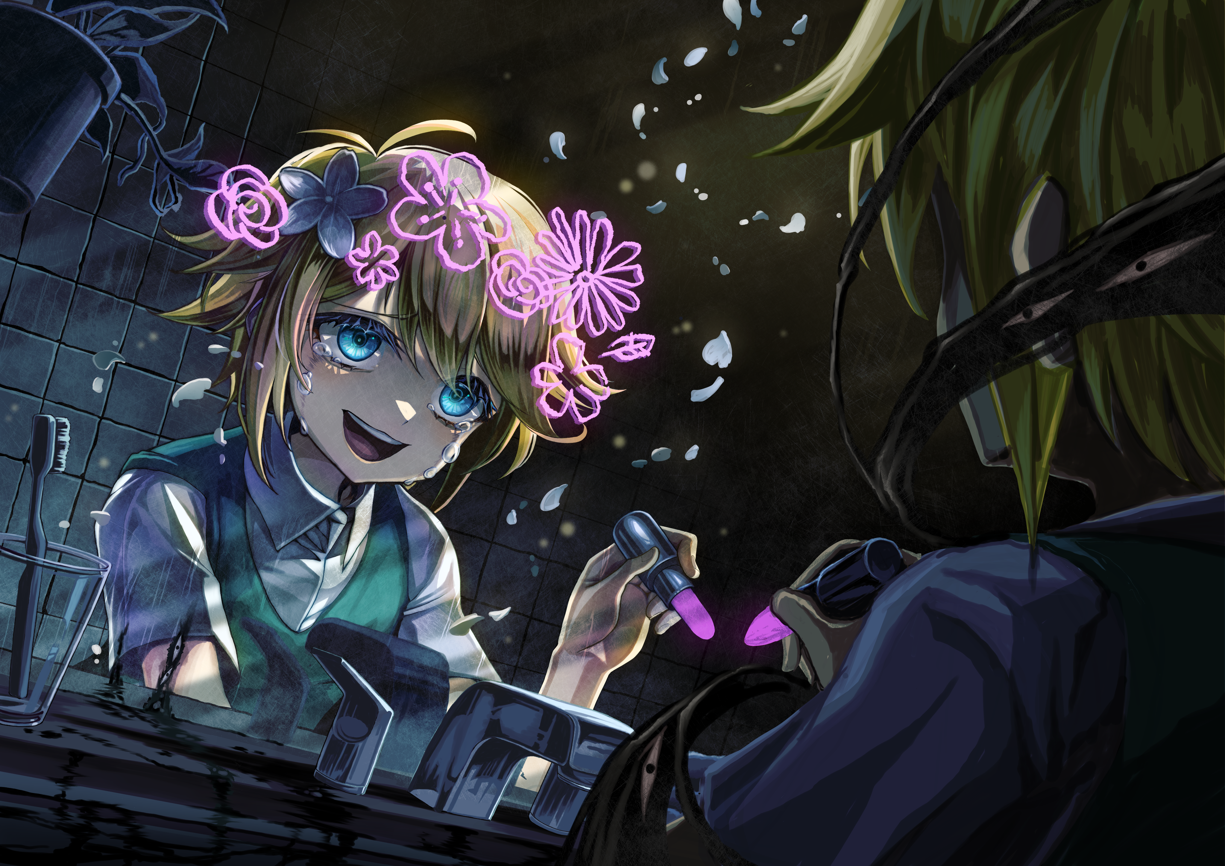 1boy absurdres basil_(faraway)_(omori) basil_(omori) bathroom blonde_hair blue_eyes collared_shirt crying crying_with_eyes_open cup green_sweater_vest highres looking_at_mirror mirror omori open_mouth shirt short_hair short_sleeves solo something_(omori) spoilers sweater_vest tears teeth toothbrush tsuno_(ikkakusu) upper_teeth_only white_shirt