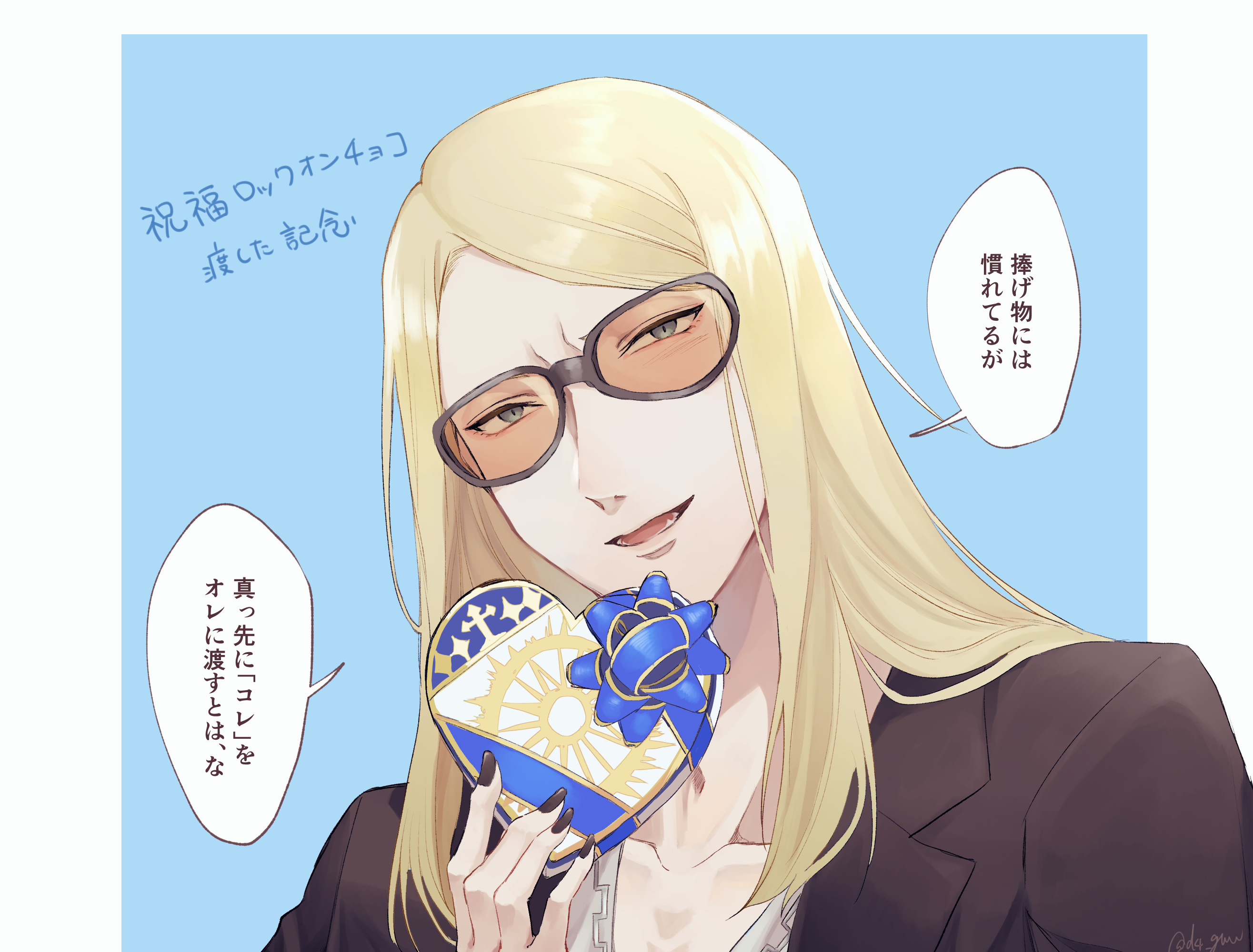 1boy black_jacket black_nails blonde_hair blue_background blue_eyes fate/grand_order fate_(series) highres jacket long_hair looking_at_viewer male_focus open_clothes open_jacket orange-tinted_eyewear shirt simple_background solo speech_bubble sunglasses tezcatlipoca_(fate) tezcatlipoca_(first_ascension)_(fate) tinted_eyewear translation_request upper_body white_shirt yutsuki_(pixiv40202660)