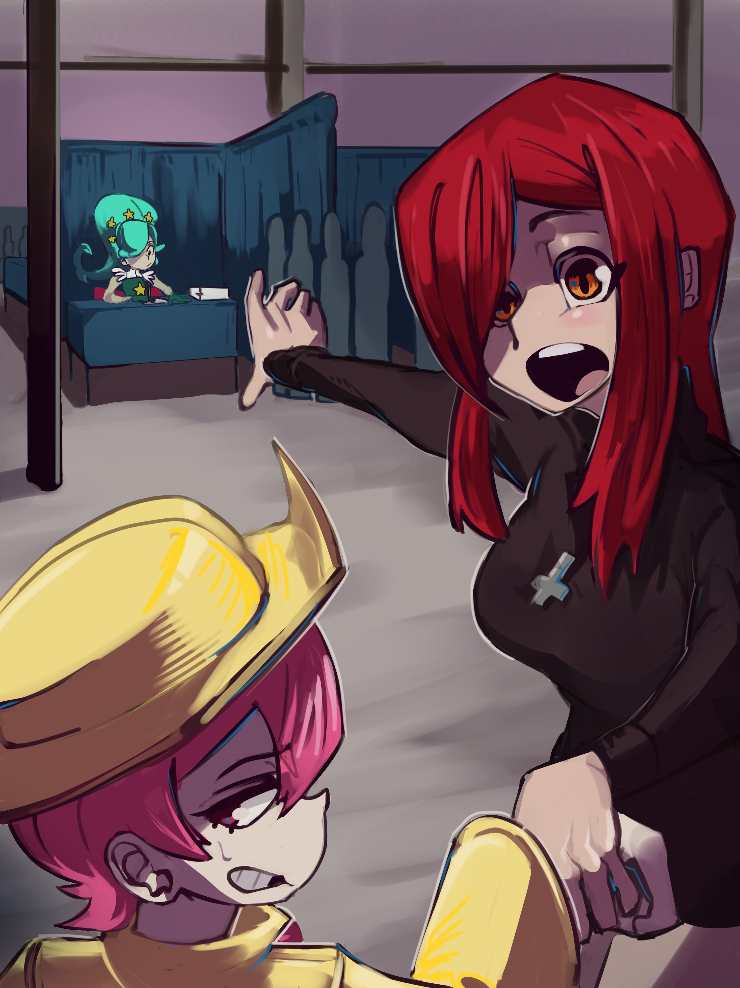 3girls absurdres alternate_hairstyle annie_(skullgirls) averting_eyes cross cross_necklace curtains frown green_hair grimace hair_over_one_eye hat highres holding_hands jewelry long_hair moxydraws multiple_girls necklace official_alternate_costume open_mouth parasoul_(skullgirls) pink_hair ponytail raincoat red_hair short_hair siblings sisters skullgirls sweatdrop sweater turtleneck turtleneck_sweater umbrella_(skullgirls) yellow_eyes