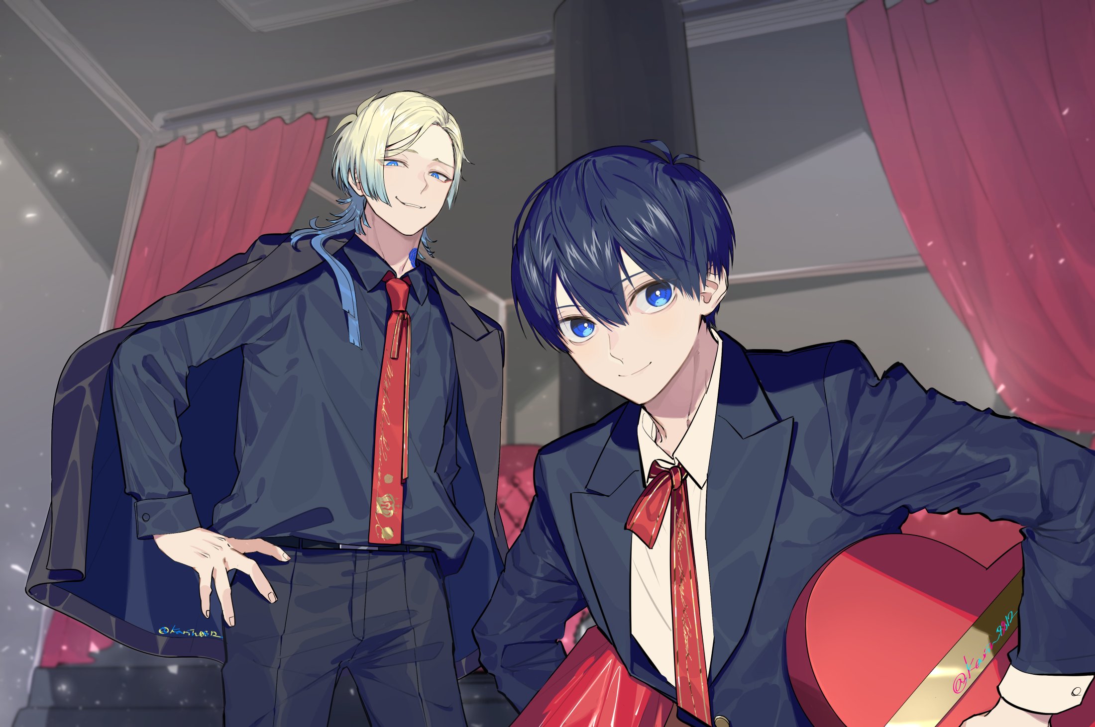 2boys belt black_belt black_jacket black_shirt black_suit blonde_hair blue_eyes blue_hair blue_lock box closed_mouth collared_shirt cowboy_shot curtains formal_clothes gradient_hair hand_on_own_hip heart-shaped_box highres indoors isagi_yoichi jacket jacket_on_shoulders long_sleeves looking_at_viewer male_focus michael_kaiser multicolored_hair multiple_boys neck_tattoo necktie red_necktie shirt short_hair smile sohu standing suit tattoo tsurime two-tone_hair upper_body white_shirt