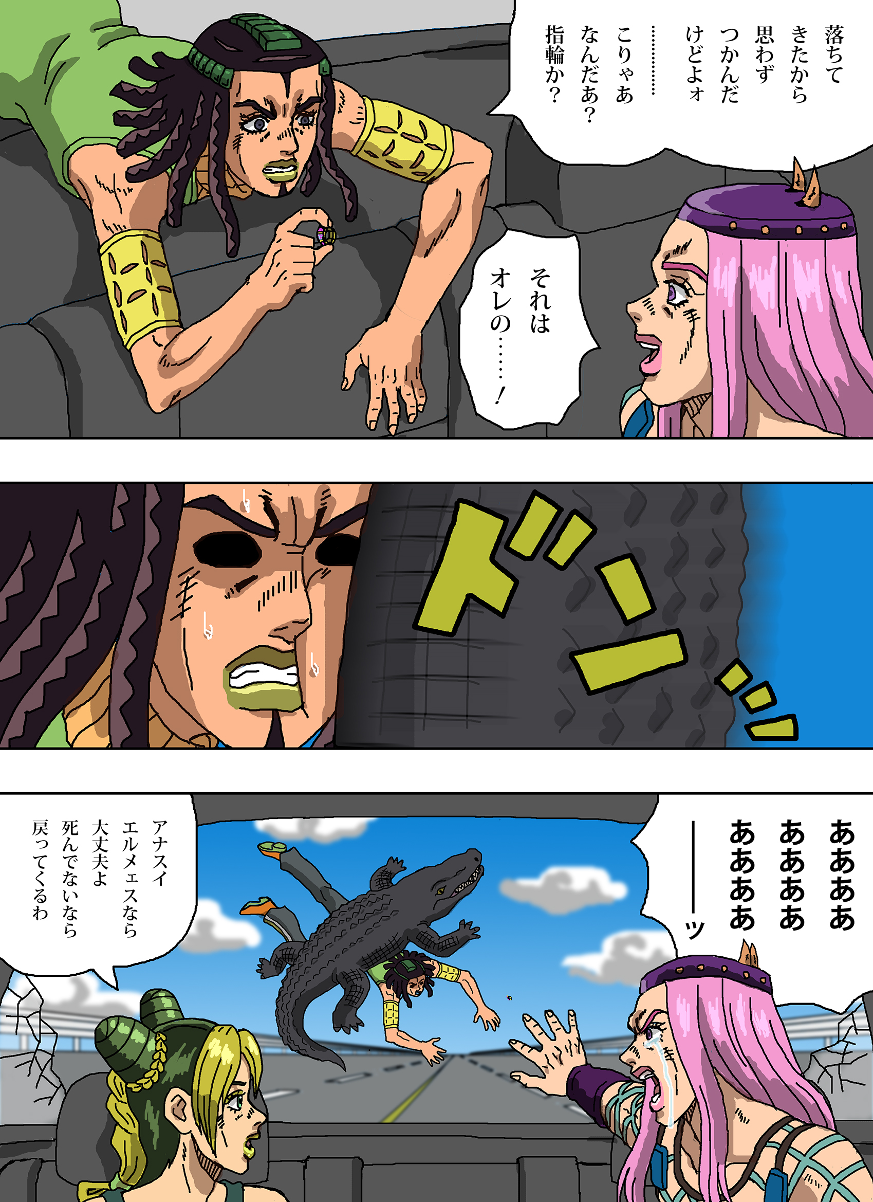 1boy 2girls armband black_eyes black_hair blonde_hair blue_sky braid broken_window bun_with_braided_base clenched_teeth cloud comic commentary_request crocodile crocodilian crying double_bun dreadlocks ermes_costello fake_horns fishnet_top fishnets green_hair green_lips hair_bun hat highres highway holding holding_jewelry holding_ring horned_headwear horns jewelry jojo_no_kimyou_na_bouken kuujou_jolyne long_hair multicolored_hair multiple_girls narciso_anasui open_mouth pink_eyes pink_hair pink_lips ring shideboo_(shideboh) sky smile stone_ocean streaming_tears tears teeth translation_request two-tone_hair