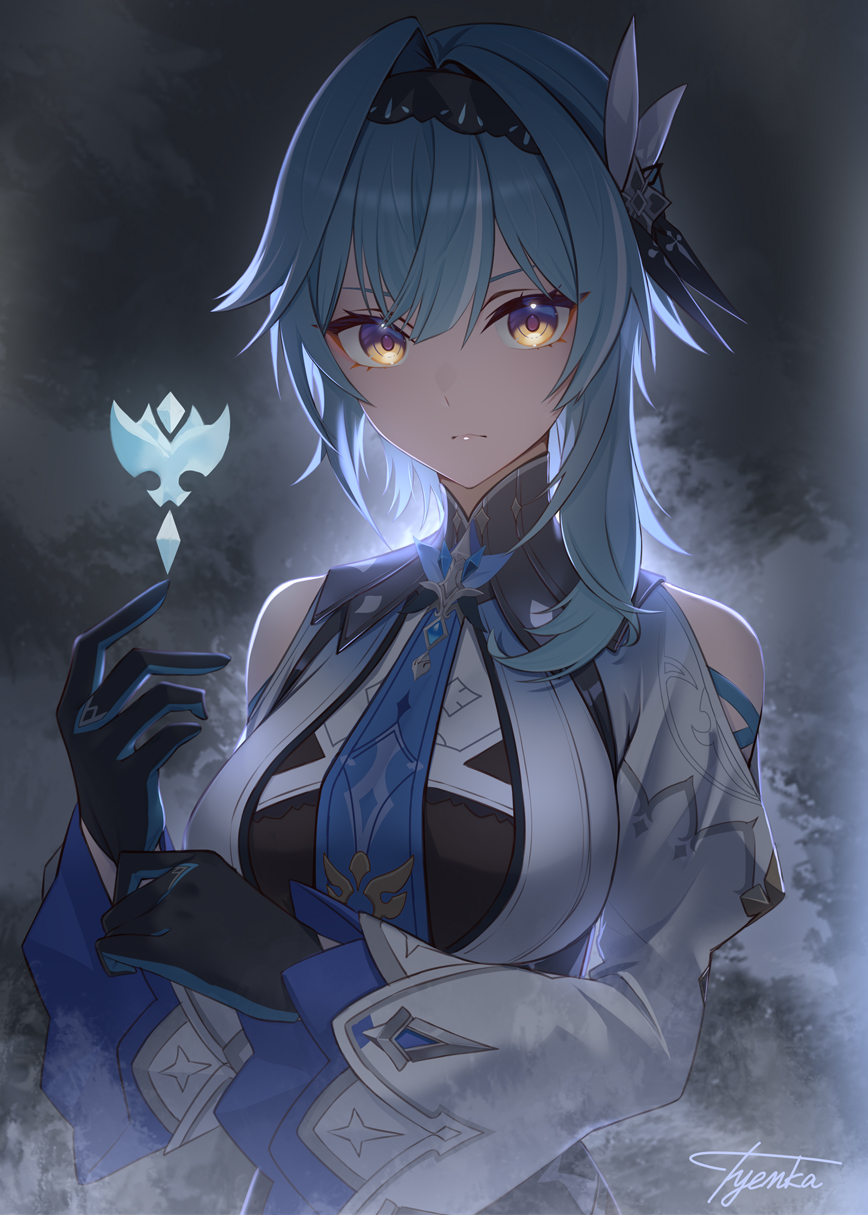 1girl black_gloves black_hairband blue_hair blue_necktie breasts cape chest_harness clothing_cutout eula_(genshin_impact) genshin_impact gloves hair_ornament hairband harness highres large_breasts long_sleeves medium_hair necktie puffy_long_sleeves puffy_sleeves shoulder_cutout signature simple_background solo tyenka7728 upper_body vision_(genshin_impact) white_sleeves yellow_eyes