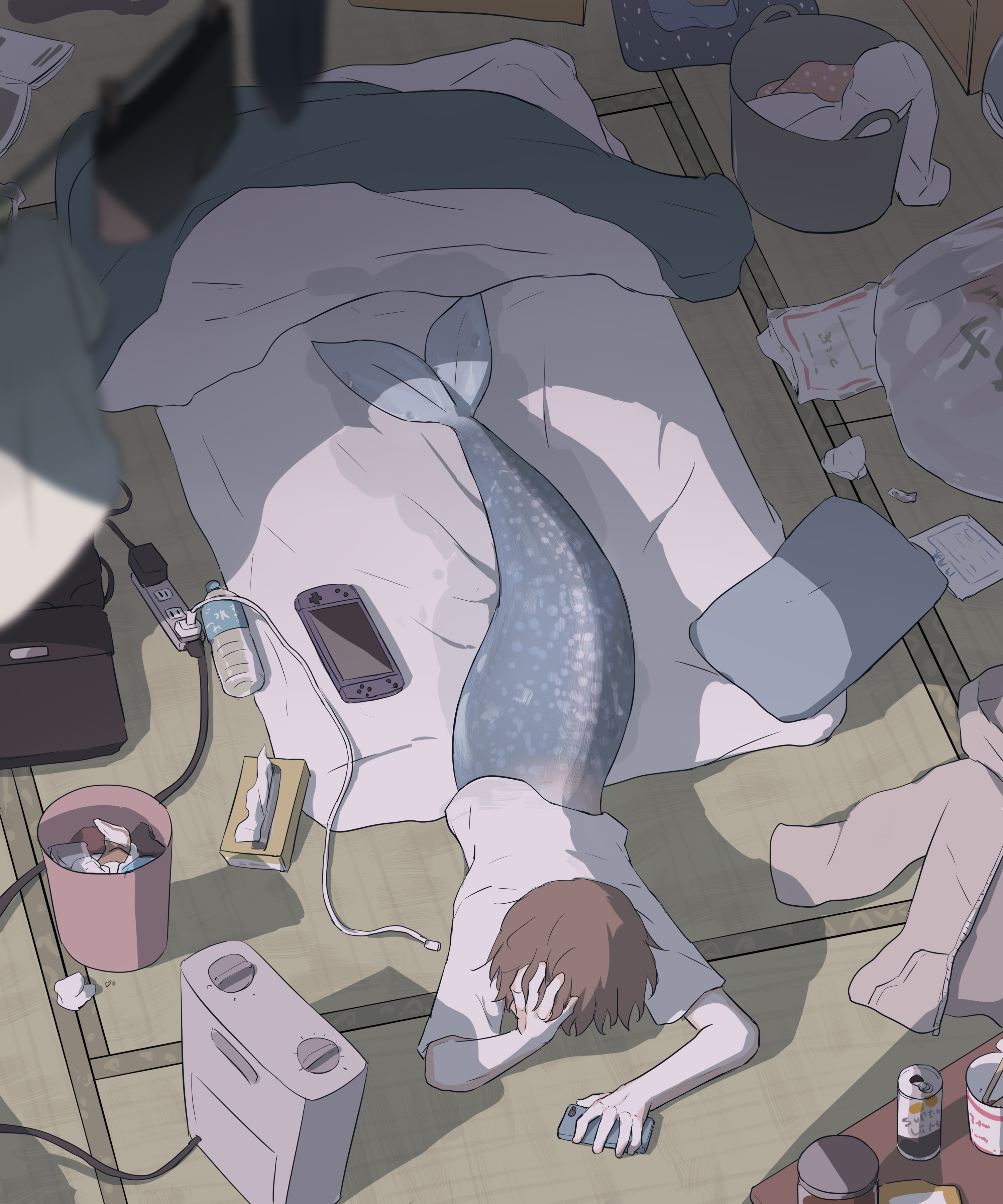 1boy absurdres avogado6 blanket blurry blurry_foreground bottle boxer_briefs brand_name_imitation can cellphone futon hand_on_own_head handheld_game_console highres holding holding_phone indoors instant_noodles instant_ramen jacket laundry lying male_focus male_underwear merfolk merman messy_room monster_boy nintendo_switch on_floor on_stomach original phone pillow power_strip shadow shirt smartphone solo t-shirt table tatami tissue_box transformation trash_can underwear unworn_jacket used_tissue water_bottle wet white_shirt