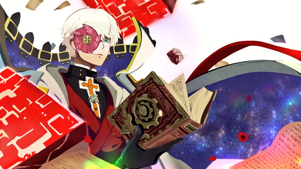 101sh965 1boy aqua_eyes asuka_r._kreutz black_gloves book closed_mouth cube eyepatch gloves grimoire guilty_gear guilty_gear_strive holding holding_book long_sleeves looking_at_viewer male_focus open_book short_hair upper_body white_background white_hair