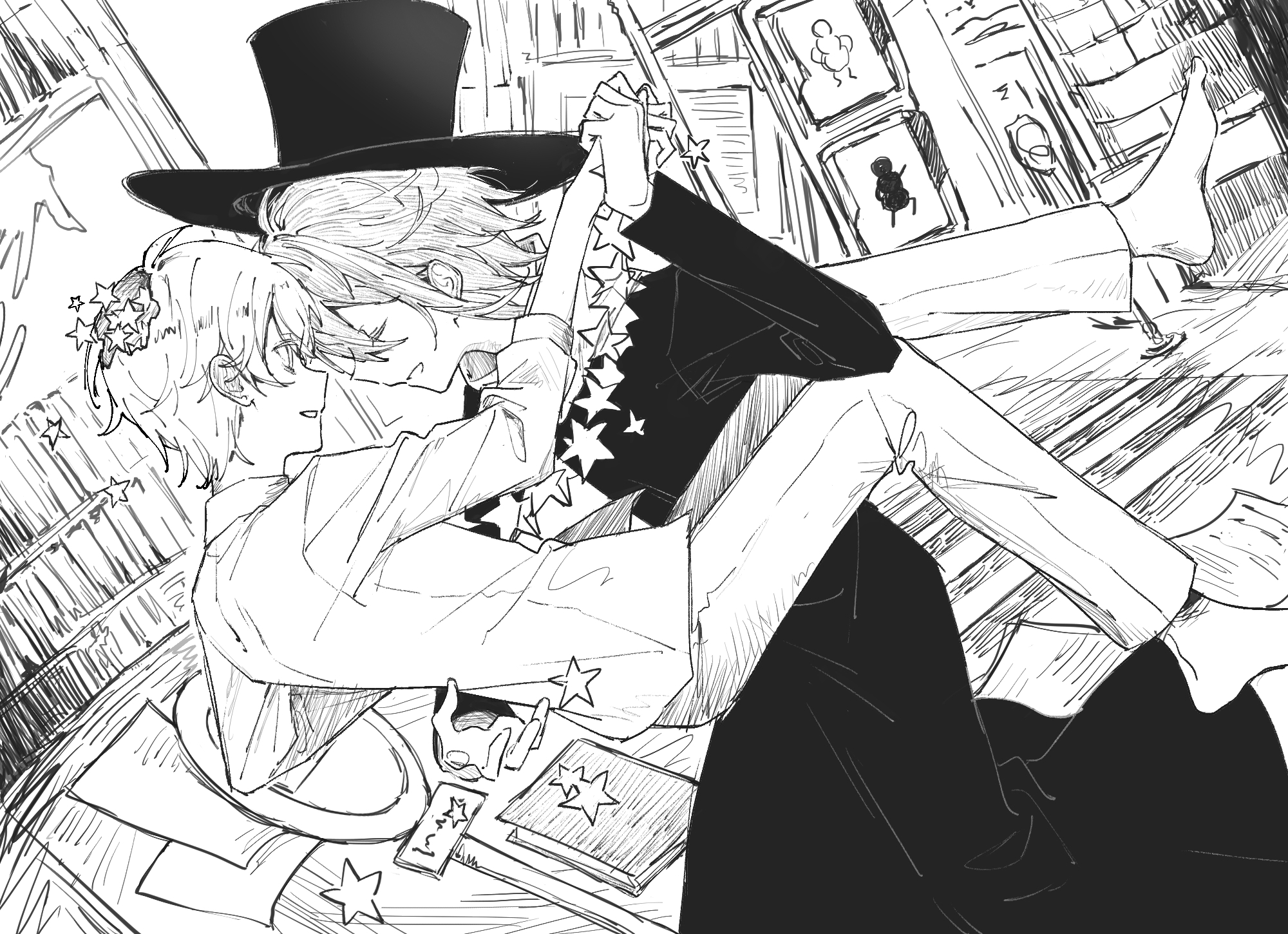 2boys ban-chan ban-chan_(cosplay) barefoot book closed_eyes coat commentary cosplay dancing facing_another floating greyscale hat highres hitotsume-sama hitotsume-sama_(cosplay) hole_in_head kamishiro_rui lamppost long_sleeves looking_at_another monochrome multicolored_hair multiple_boys nonsense_bunkaku_(vocaloid) open_mouth pants paper plate project_sekai prsk112277 shirt smile star_(symbol) streaked_hair tenma_tsukasa top_hat yaoi