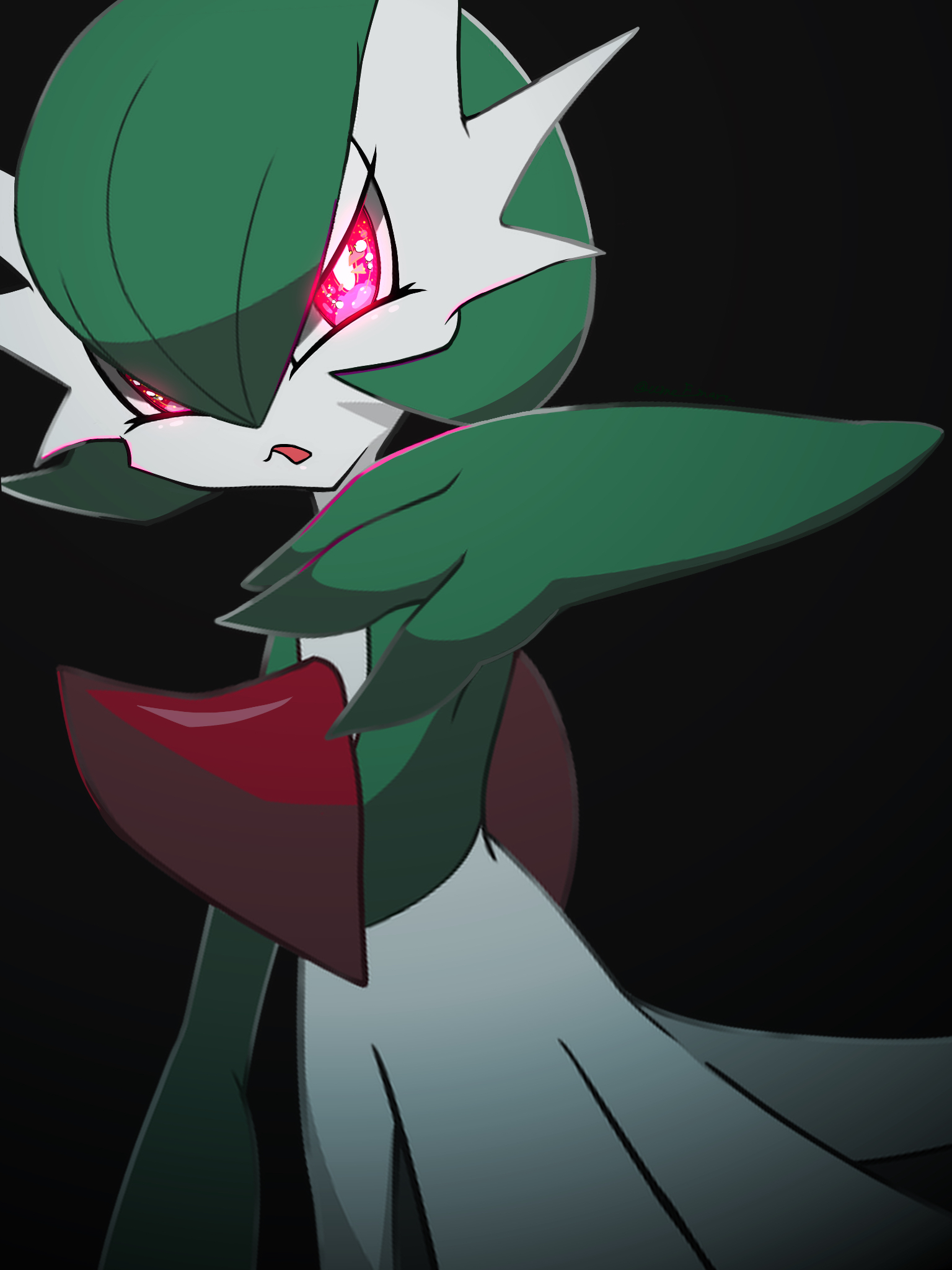 1girl annoyed arm_at_side arm_up black_background bob_cut bright_pupils colored_skin cowboy_shot dark female_focus flat_chest gardevoir gen_3_pokemon glowing glowing_eyes green_hair green_skin hair_between_eyes half-closed_eyes highres looking_at_viewer multicolored_skin nintendo open_mouth pokemon pokemon_(creature) red_eyes short_hair simple_background solo standing two-tone_skin ume_emaru white_pupils white_skin