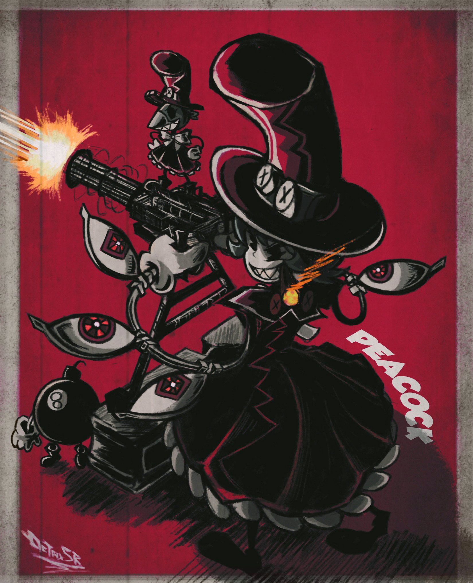 1girl apron avery_(skullgirls) cigar cyborg firing frilled_apron frills full_body gatling_gun george_the_bomb grin hat highres looking_at_viewer looking_back minigun open_mouth orange_hair peacock_(skullgirls) red_background red_eyes sharp_teeth short_hair skullgirls smile smoking solo tax_oc teeth top_hat