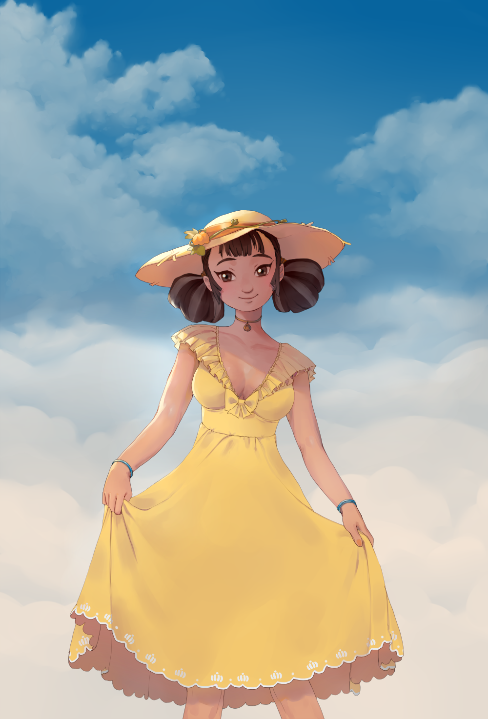 1girl alternate_costume alternate_hairstyle black_hair blue_sky blush bracelet brown_eyes cloud cloudy_sky cowboy_shot dress food-themed_hair_ornament hair_ornament hat hat_ornament highres jewelry jnrbtts kina_(zelda) multicolored_hair necklace nintendo pumpkin_hair_ornament sky smile solo sun_hat sundress the_legend_of_zelda the_legend_of_zelda:_skyward_sword twintails two-tone_hair white_hair