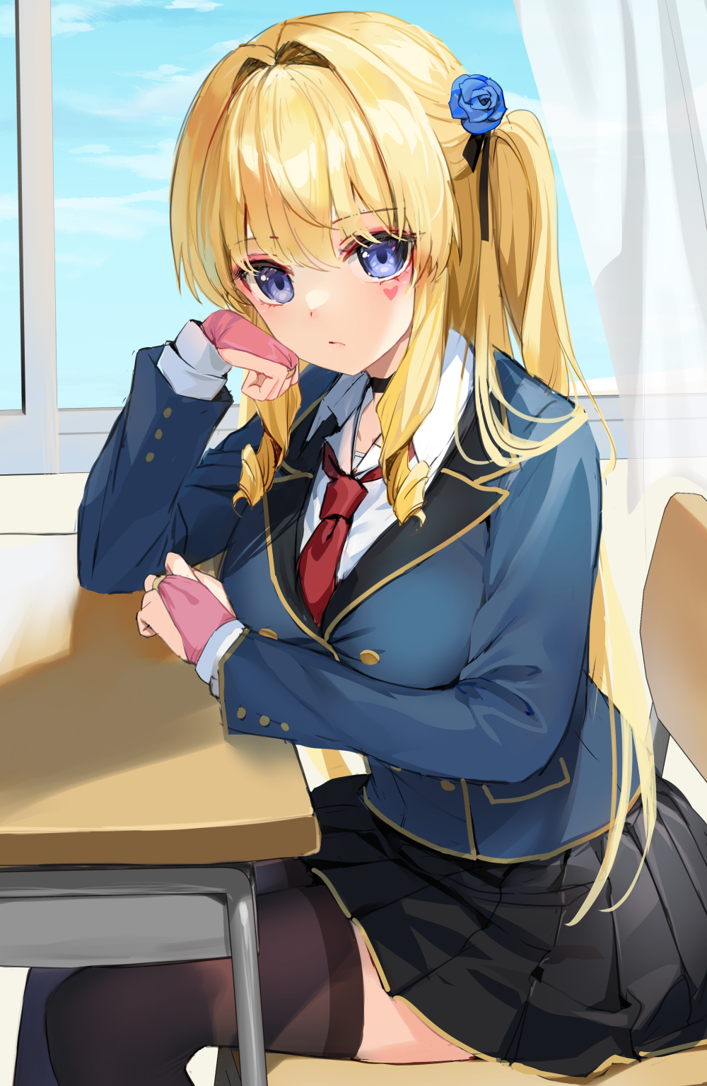 1girl black_skirt black_thighhighs blazer blonde_hair blue_eyes blue_jacket breasts bridal_gauntlets chair drill_hair flower hair_flower hair_ornament heart heart_tattoo highres jacket long_hair medium_breasts miniskirt mvv on_chair original school_uniform sitting skirt tattoo thighhighs twin_drills twintails