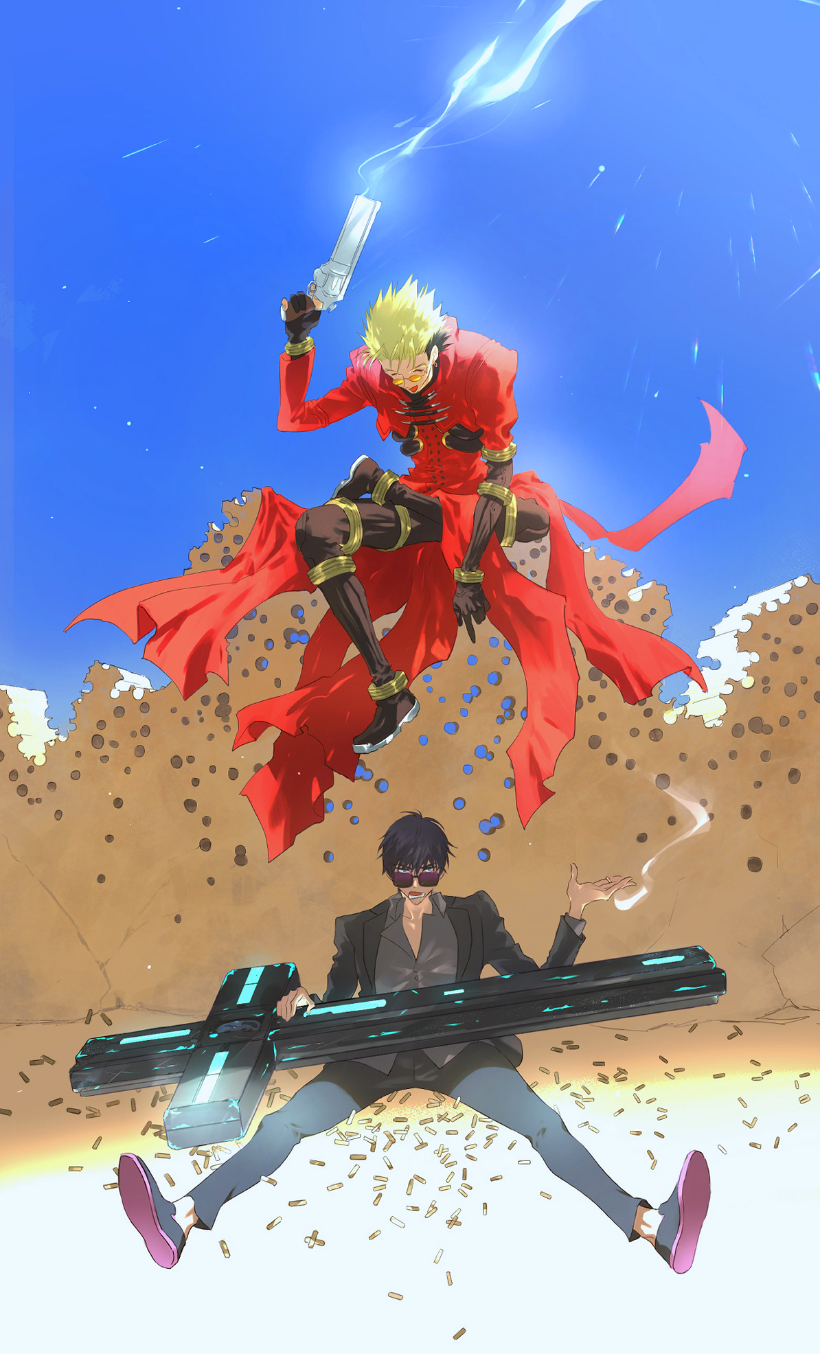 2boys ^_^ agl_arms_.45_long_colt ammunition ba3969787585976 black_gloves black_hair black_jacket black_pants blonde_hair break-action_revolver bullet_hole cigarette closed_eyes coat collared_shirt cross day earrings fingerless_gloves full_body glasses gloves grey_shirt gun hand_up handgun handgun_cartridge highres holding holding_cigarette holding_gun holding_weapon jacket jewelry long_sleeves looking_at_viewer low_bore_axis_revolver male_focus multiple_boys nicholas_d._wolfwood open_mouth orange-tinted_eyewear outdoors pants red_coat revolver revolver_cartridge shell_casing shirt single_earring sitting smile smoke sunglasses tinted_eyewear trigun trigun_stampede vash_the_stampede wall weapon