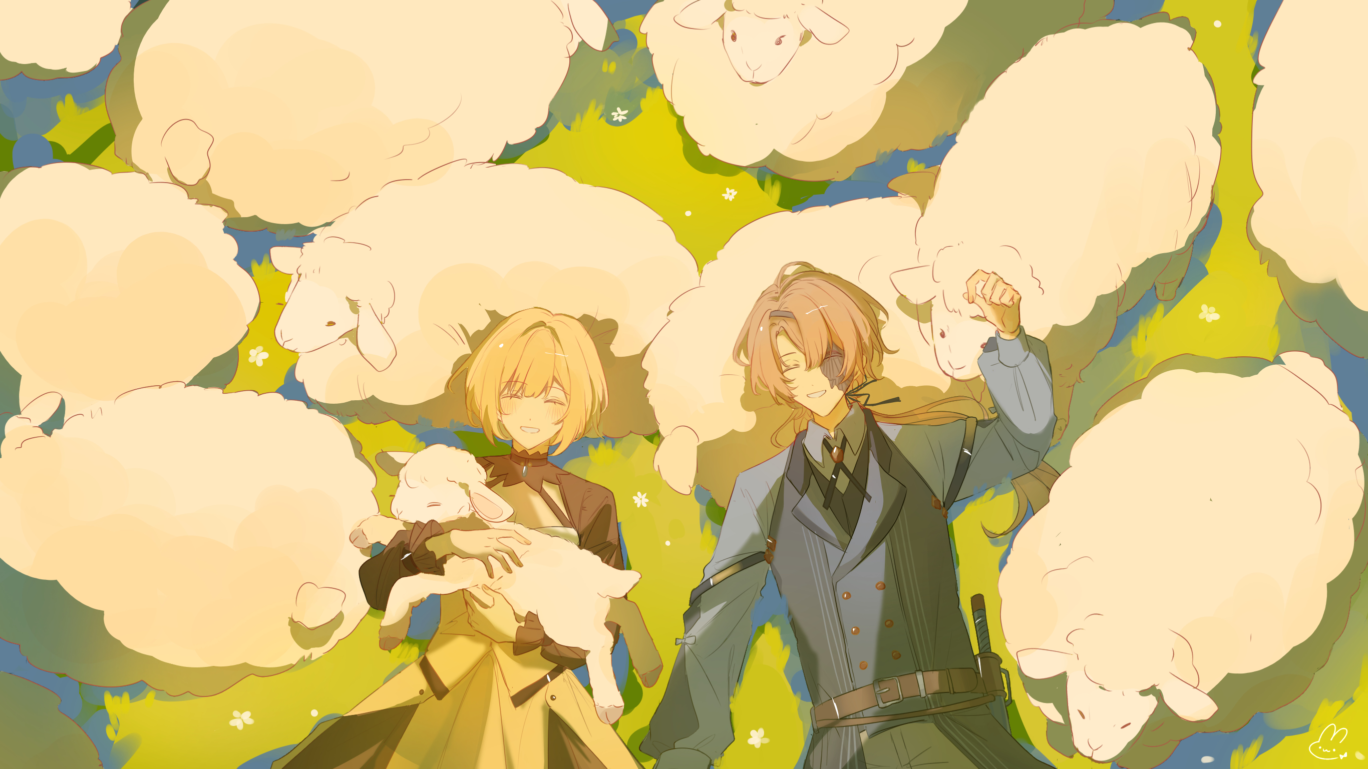 1boy 1girl animal belt black_sleeves blonde_hair blush brown_belt brown_hair ceres_(shuuen_no_virche) closed_eyes eyepatch facing_up facing_viewer grass grey_shirt highres holding holding_animal lying on_back on_ground sheep shirt shuuen_no_virche skirt smile teeth w047 yellow_skirt yves_(shuuen_no_virche)