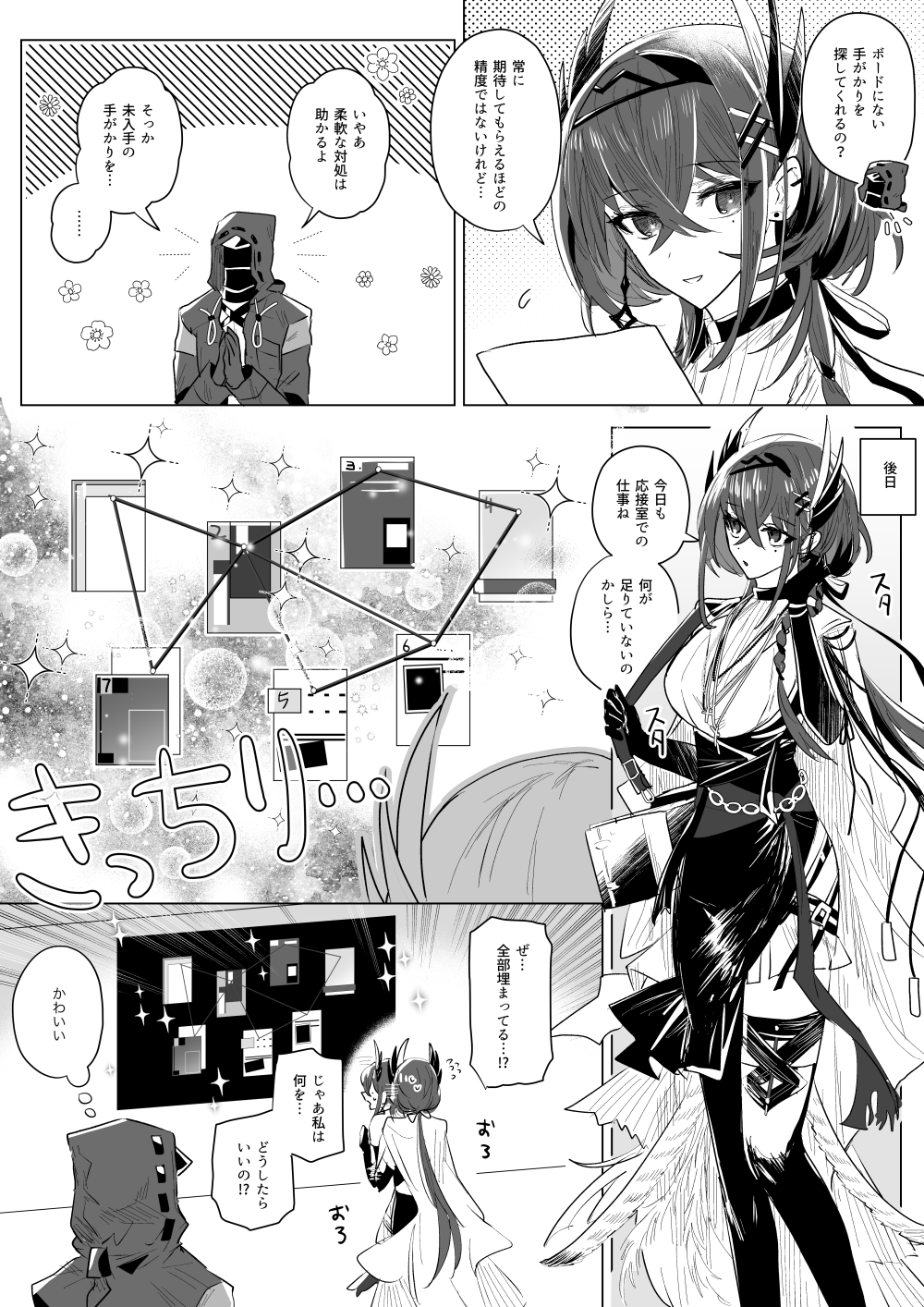 1girl 1other afterimage arknights breasts cantabile_(arknights) comic doctor_(arknights) earrings flying_sweatdrops gloves greyscale hair_between_eyes highres hood hood_up hooded_jacket iwashi_80 jacket jewelry long_hair long_sleeves medium_breasts mole mole_under_eye monochrome notice_lines open_clothes open_jacket palms_together shirt skirt smile stud_earrings thighhighs translation_request very_long_hair