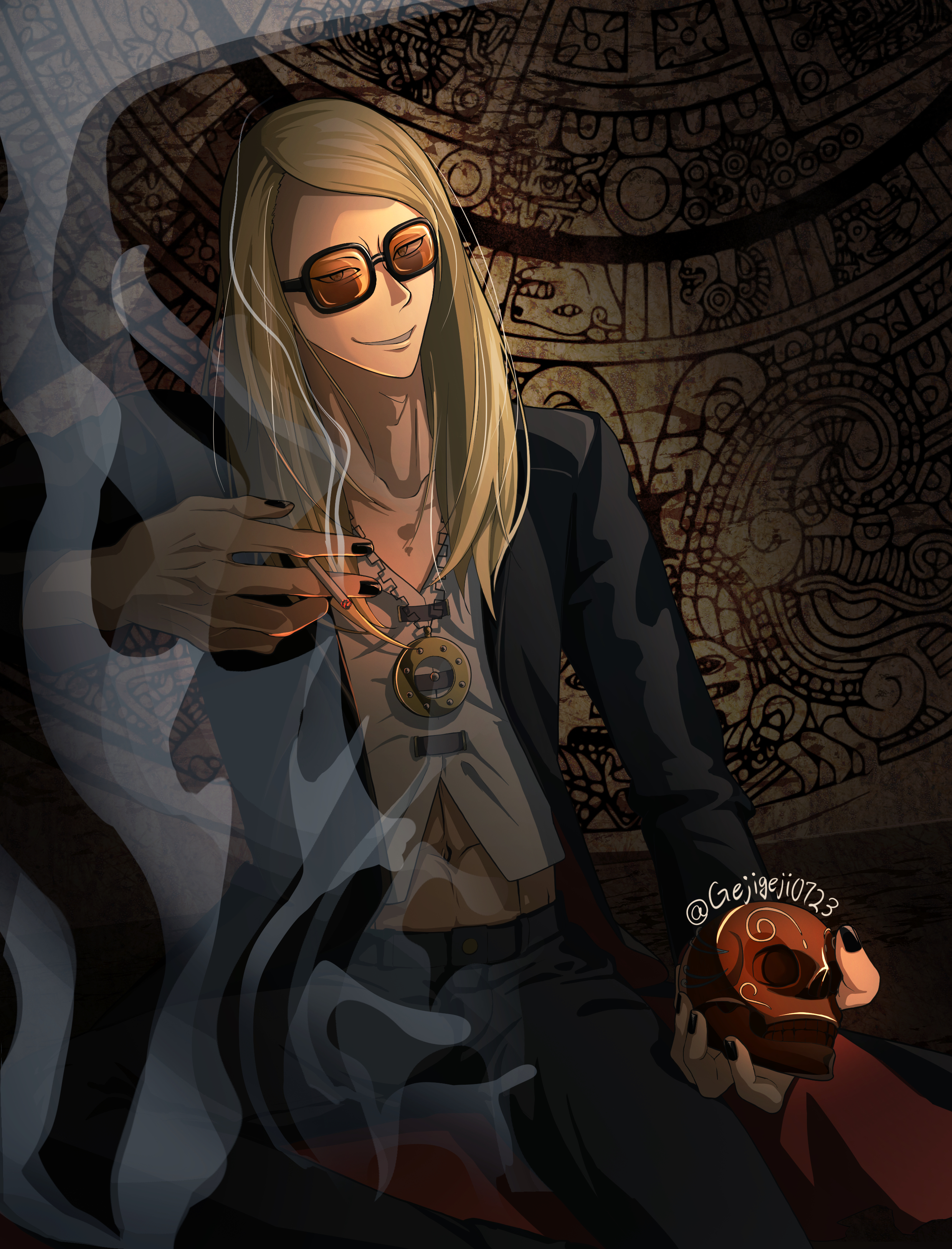 1boy absurdres black_jacket black_nails black_pants blonde_hair cigarette fate/grand_order fate_(series) flapper_shirt gejigeji0723 highres holding holding_cigarette holding_skull indoors jacket jewelry long_hair looking_at_viewer male_focus medallion necklace open_clothes open_jacket orange-tinted_eyewear pants shirt signature sitting skull smile smoke solo sunglasses tezcatlipoca_(fate) tezcatlipoca_(first_ascension)_(fate) tinted_eyewear white_shirt