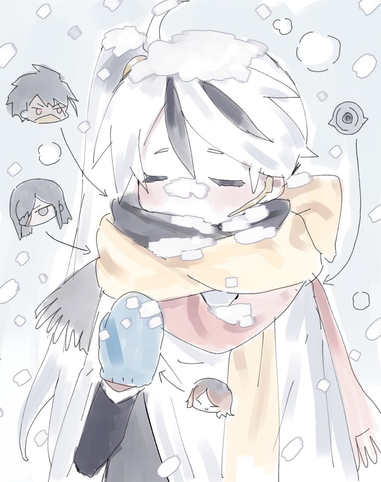 1boy ahoge black_scarf blue_gloves blush cape closed_eyes esther_(project_moon) gloria_(project_moon) gloves hubert_(library_of_ruina) library_of_ruina long_hair male_focus maratang mittens moirai_(project_moon) multicolored_hair project_moon red_scarf scarf side_ponytail snow_on_head snowing solo streaked_hair too_many too_many_scarves upper_body very_long_hair white_cape white_hair yan_vismok yellow_scarf