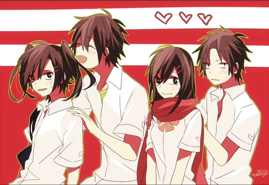 2boys 2girls :d ^_^ bangs_pinned_back black_eyes bow bowtie bright_pupils brown_eyes brown_hair closed_eyes closed_mouth collared_shirt commentary commentary_request dated double-parted_bangs english_commentary enomoto_takane enpera eyes_visible_through_hair facing_to_the_side from_side hair_between_eyes hair_ornament hairclip hand_on_another's_shoulder heart kagerou_project kisaragi_shintarou kokonose_haruka light_blush limited_palette lineup long_hair looking_at_viewer mixed-language_commentary multiple_boys multiple_girls open_collar open_mouth outline parted_lips partial_commentary pink_bow pink_bowtie red_background red_scarf scarf school_uniform shirt short_hair short_sleeves signature smile t-shirt tateyama_ayano teeth tsuki_miyabi twintails two-tone_background upper_body upper_teeth_only white_background white_shirt yellow_outline yellow_shirt