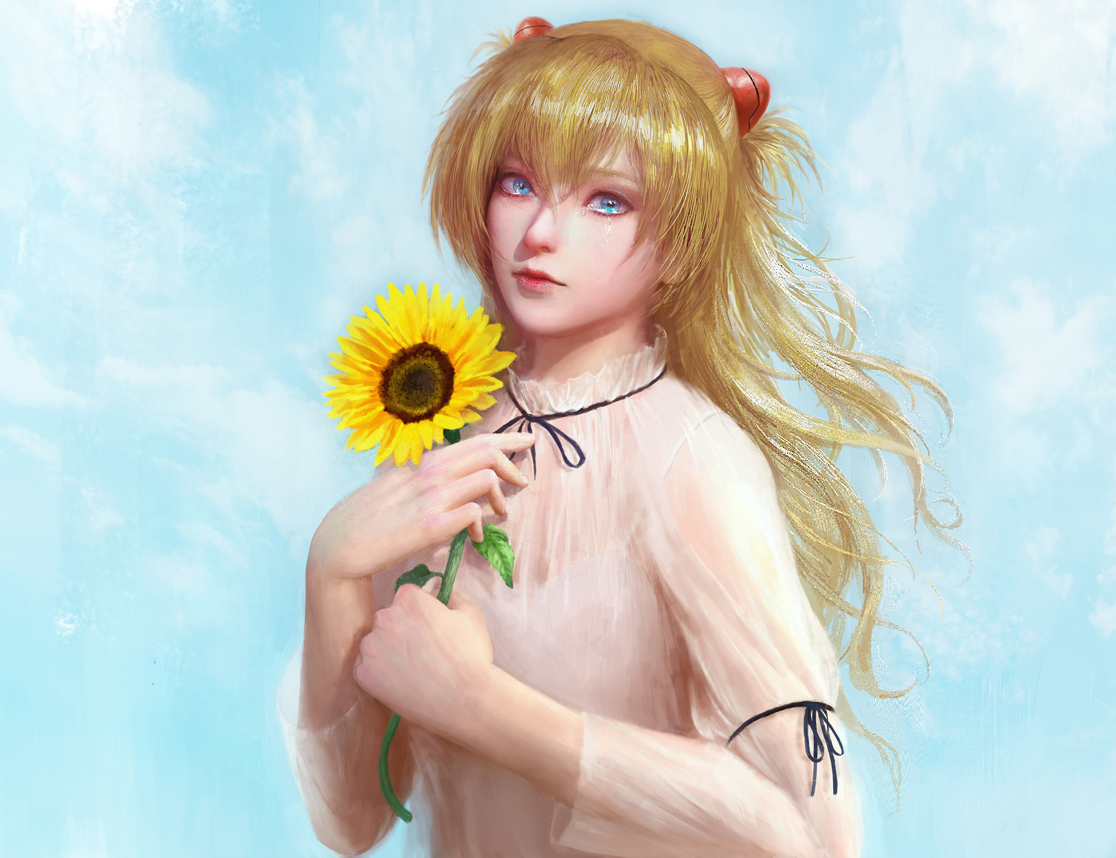 1girl absurdres alternate_costume blue_eyes closed_mouth crying crying_with_eyes_open flower hair_over_eyes highres holding holding_flower interface_headset_(evangelion) long_hair looking_at_viewer neon_genesis_evangelion orange_hair realistic solo souryuu_asuka_langley sunflower tears xianggang_jizhe yellow_flower