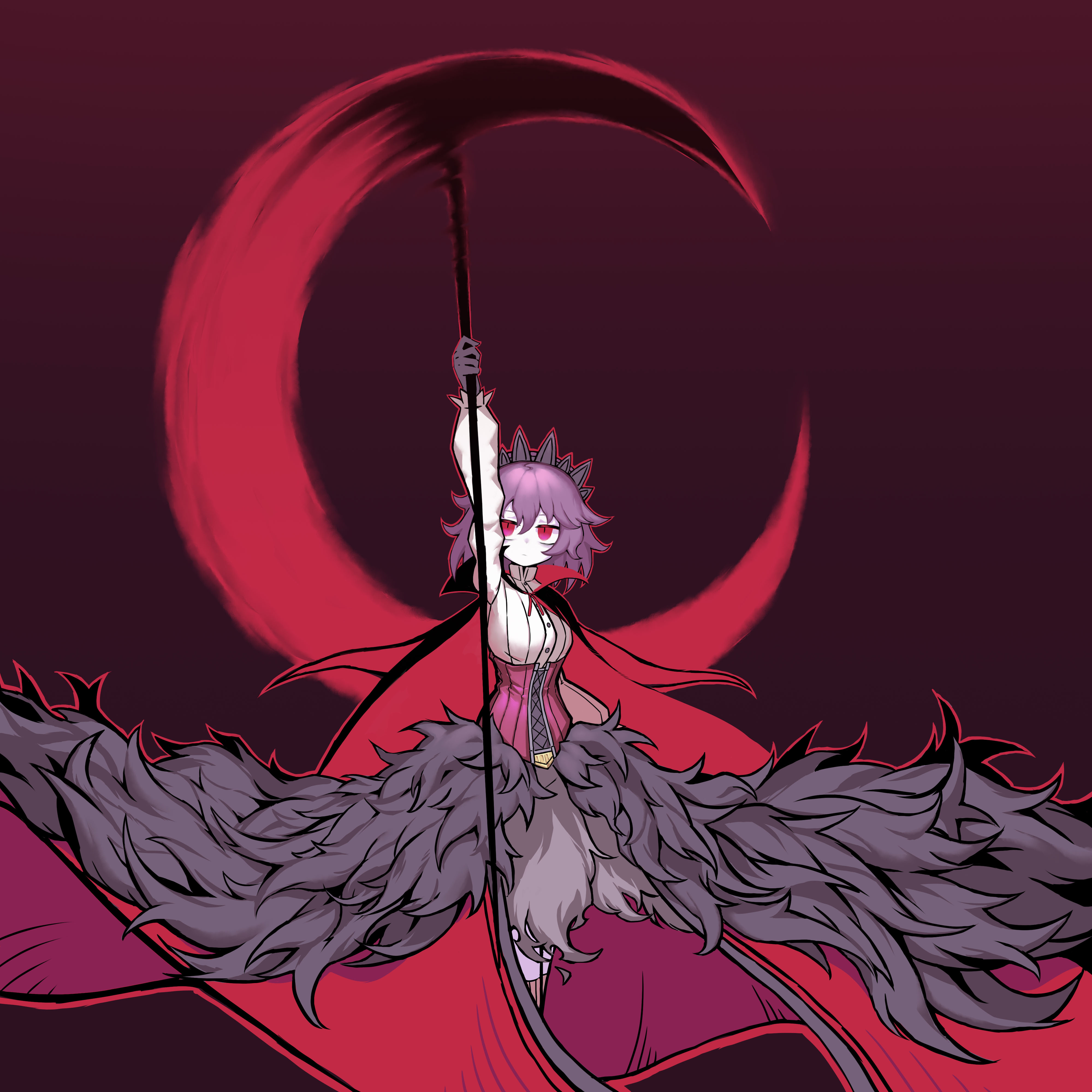 1girl absurdres alasharx arm_up black_cape black_hairband buttons cape colored_skin corset gradient_background grey_skirt hair_between_eyes hairband high_collar highres holding holding_scythe long_sleeves looking_up maria_(sequel) orange_thighhighs outline overskirt pink_eyes puffy_long_sleeves puffy_sleeves purple_hair red_cape red_outline scythe sequel_(series) sequel_awake shirt short_hair skirt solo thighhighs two-tone_cape white_shirt white_skin