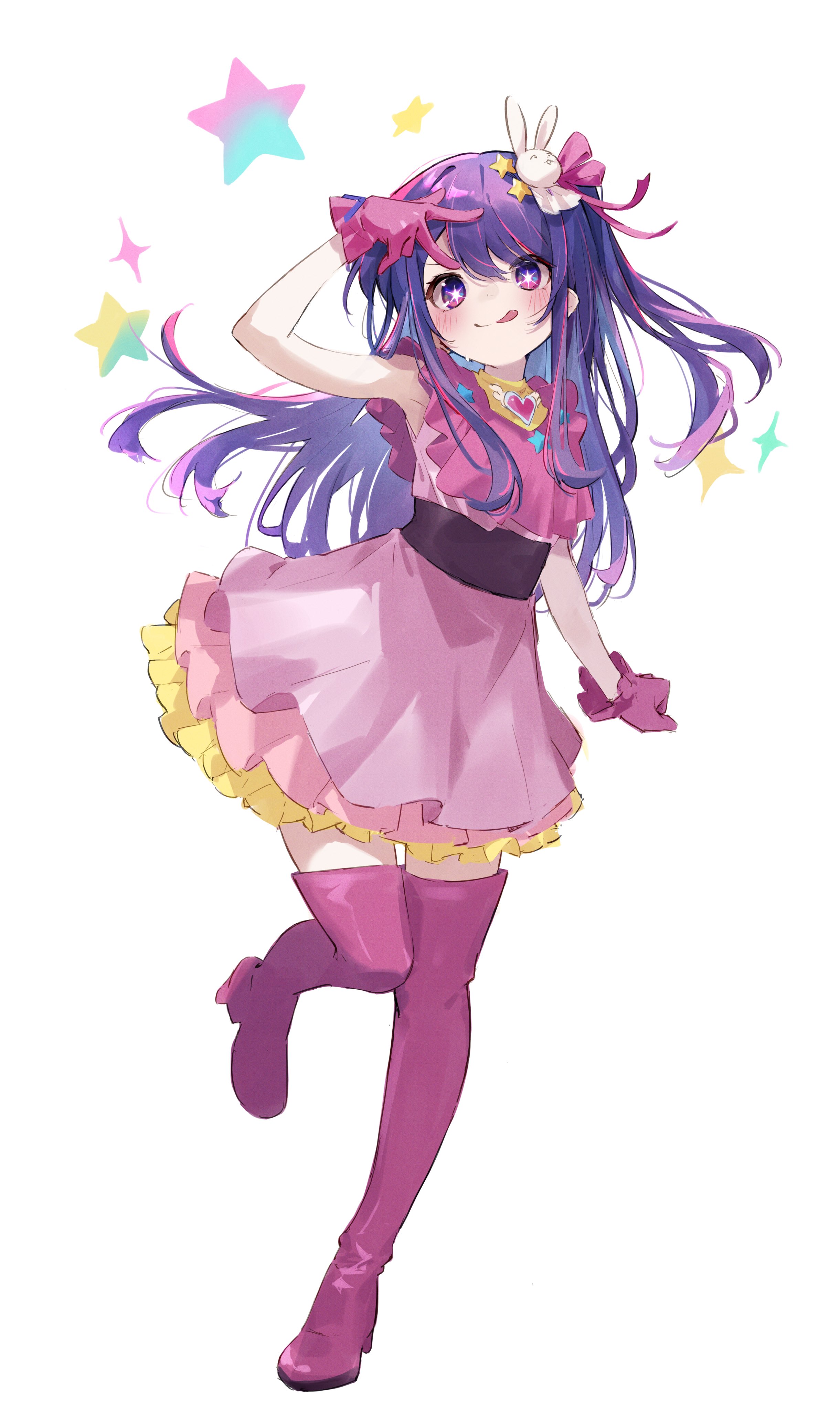 1girl :q absurdres blush boots brooch dress frilled_dress frilled_gloves frills full_body gloves hair_between_eyes hair_ornament heart heart_brooch highres hoshino_ai jewelry long_hair oguri_(oguri_yuta) one_side_up oshi_no_ko pink_boots pink_dress pink_gloves purple_eyes purple_hair rabbit_hair_ornament sidelocks simple_background sleeveless sleeveless_dress solo standing standing_on_one_leg star-shaped_pupils star_(symbol) swept_bangs symbol-shaped_pupils thigh_boots tongue tongue_out v white_background