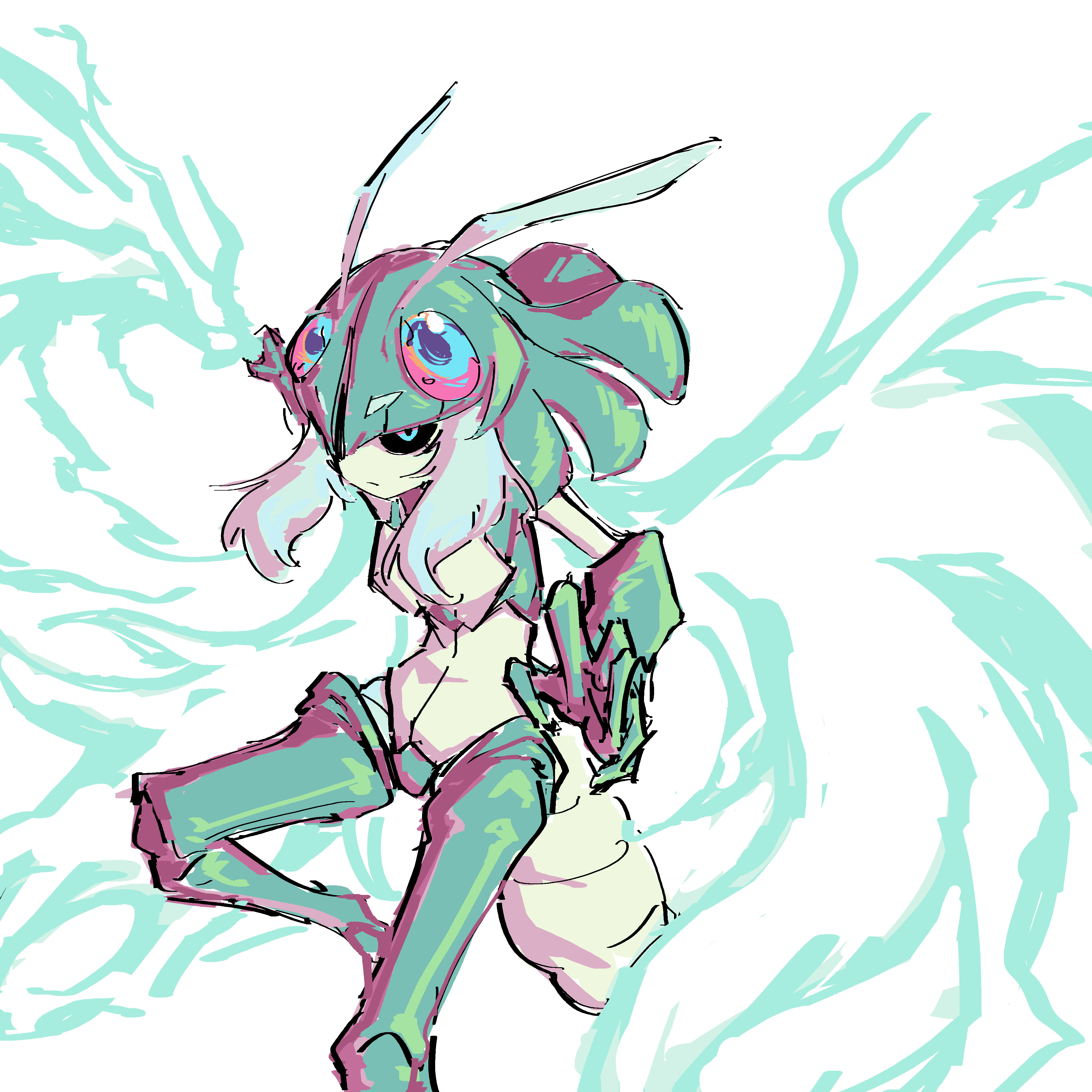 1girl absurdres alasharx antennae arthropod_girl arthropod_limbs black_sclera blue_eyes blue_hair chinese_commentary closed_mouth colored_sclera colored_skin commentary_request compound_eyes extra_eyes green_skin highres light_blue_hair long_hair multicolored_eyes pink_eyes sequel_(series) sequel_colony shin_(sequel) simple_background solo white_background