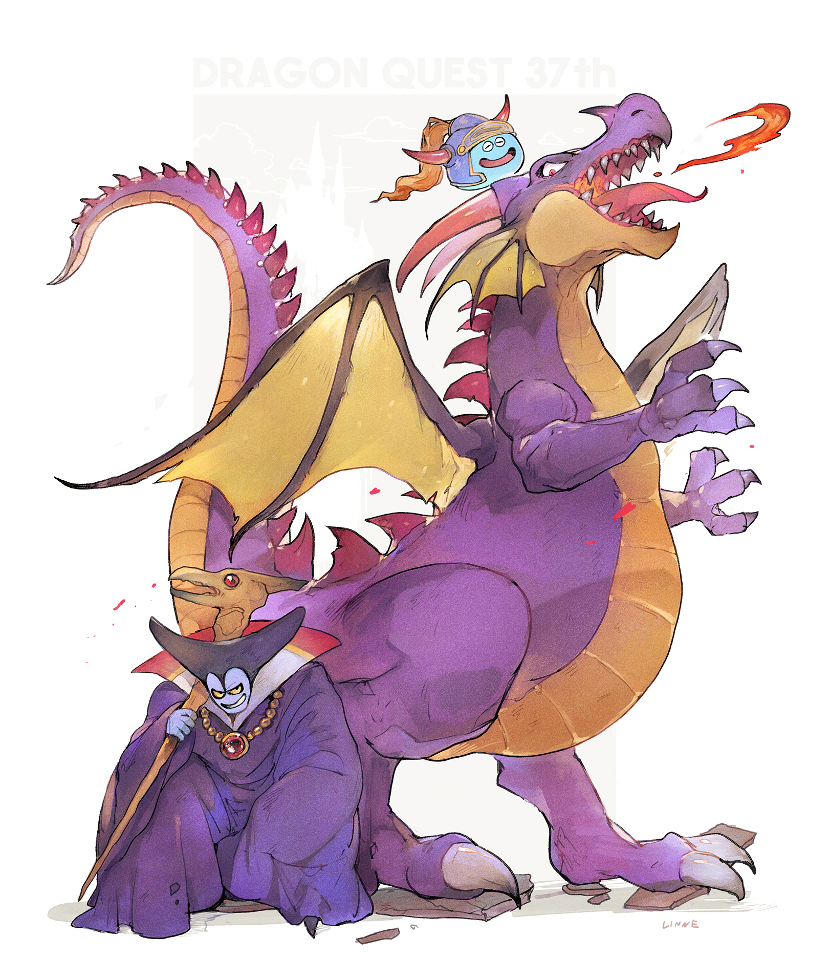 1980s_(style) 2boys anniversary blue_headwear blue_skin breath_weapon colored_skin commentary_request dragon dragon_lord dragon_quest dragon_quest_i dragon_tail dragon_wings dual_persona fake_horns fire full_body gem helmet high_collar highres holding holding_staff horned_helmet horns jewelry linne_(hld_doreko) monster multiple_boys necklace oldschool open_mouth parted_lips purple_robe purple_skin red_gem robe size_difference slime_(dragon_quest) smile staff tail tongue tongue_out very_long_sleeves wide_sleeves wings