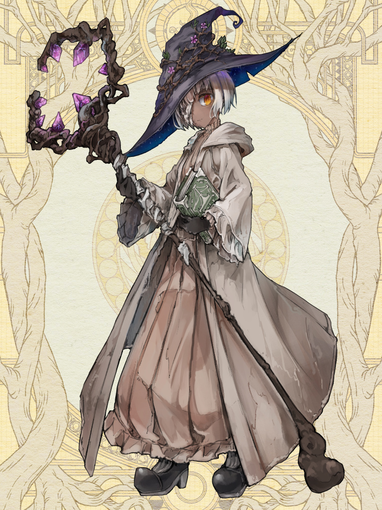 1girl black_footwear black_hat book brown_skirt clara_lindvall dairoku_ryouhei dark-skinned_female dark_skin dress eyepatch flower full_body gloves hat hat_flower holding holding_book holding_staff kajaneko long_skirt long_sleeves looking_at_viewer orange_eyes robe short_hair skirt solo staff standing white_hair wide_sleeves witch_hat yellow_background