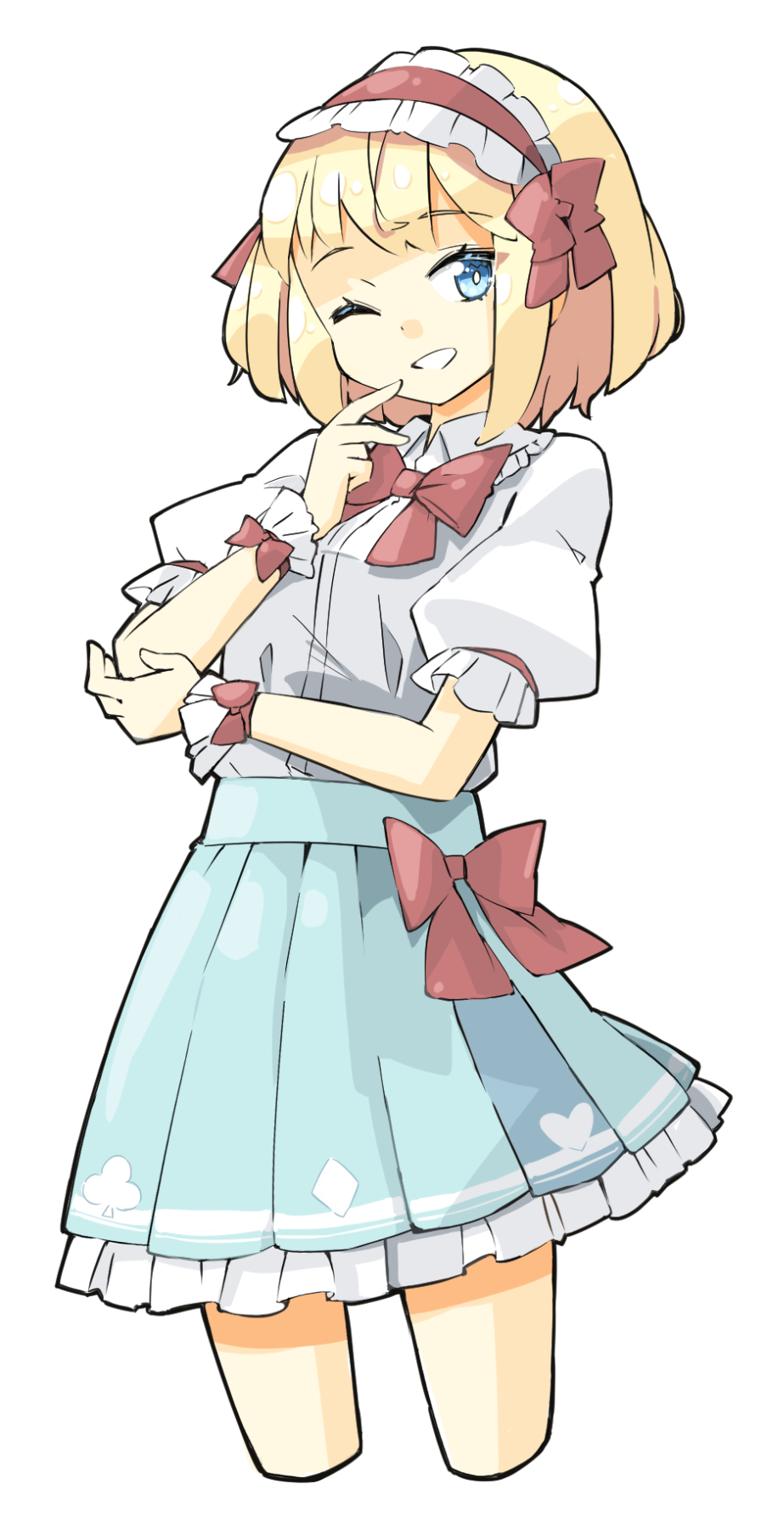 1girl alice_margatroid aqua_skirt arnest blonde_hair blue_eyes collared_shirt cropped_legs frilled_shirt_collar frilled_skirt frills hairband highres lolita_hairband one_eye_closed open_mouth pleated_skirt red_hairband shirt short_hair short_sleeves simple_background skirt smile solo touhou white_background white_shirt wrist_cuffs