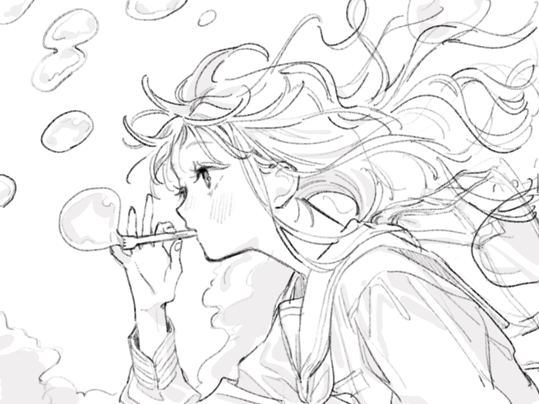 1girl blowing_bubbles from_side highres monochrome naruna_(star) original school_uniform serafuku