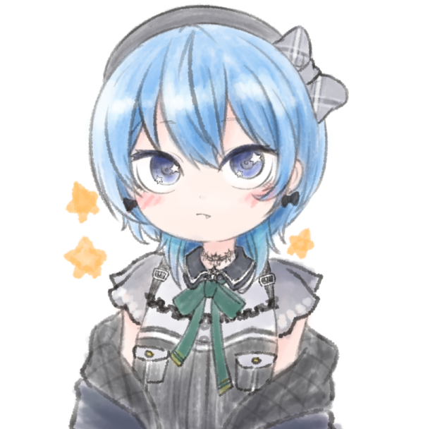 1girl beret black_choker black_dress black_hat black_shirt blue_eyes blue_hair blue_jacket blush chibi choker dress fang hat hololive hoshimachi_suisei hoshimachi_suisei_(casual) jacket lace lace_choker long_sleeves looking_at_viewer off_shoulder official_alternate_costume official_alternate_hair_length official_alternate_hairstyle shirt short_hair short_sleeves sketch solo star_(symbol) star_in_eye symbol_in_eye tonton_(tonz159) two-sided_fabric two-sided_jacket upper_body virtual_youtuber