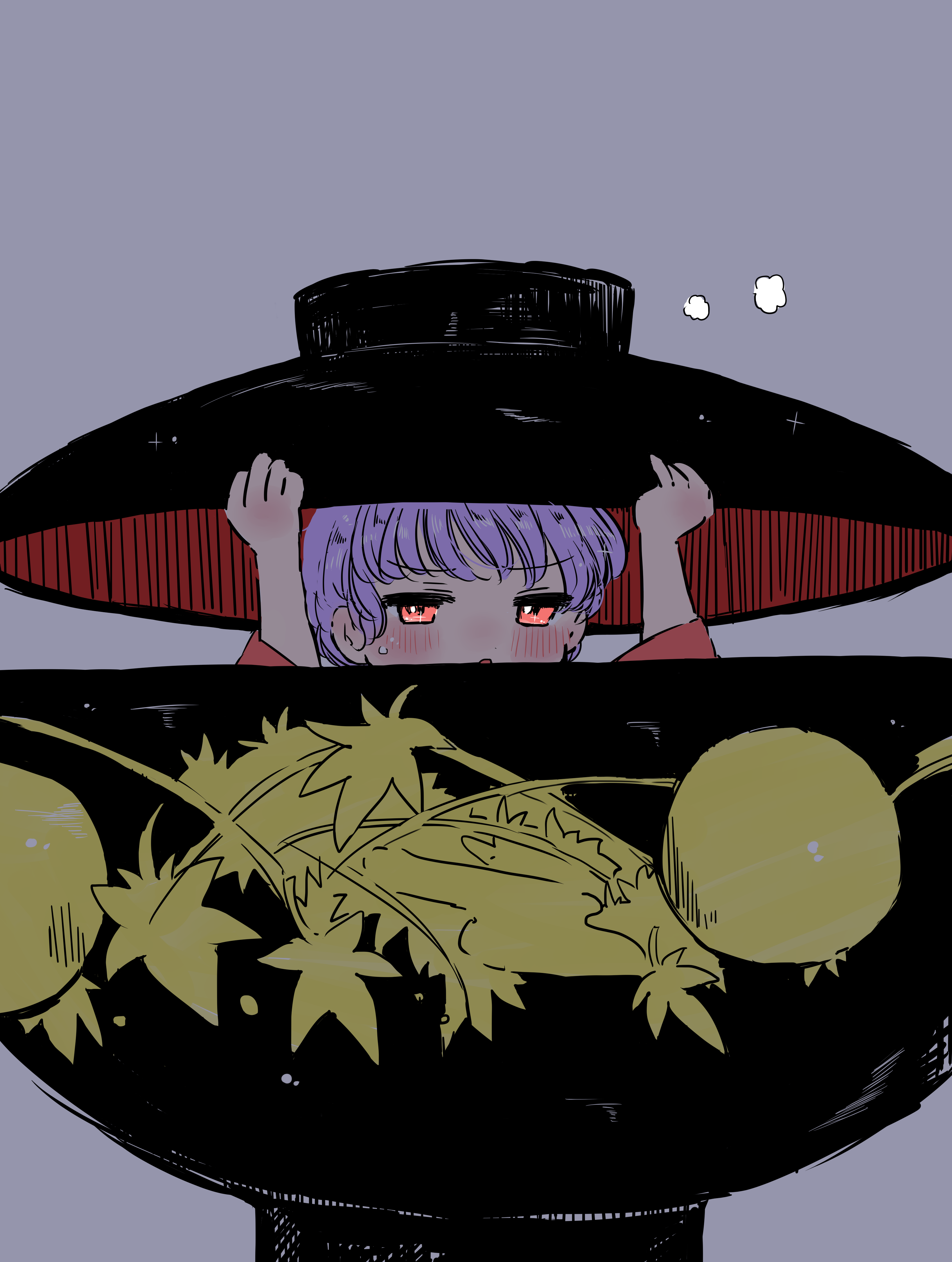 1girl absurdres black_hat blush bowl bowl_hat commentary_request flying_sweatdrops grey_background hands_on_headwear hat highres long_sleeves looking_at_viewer purple_hair red_eyes rin_tarou short_hair simple_background solo sukuna_shinmyoumaru touhou