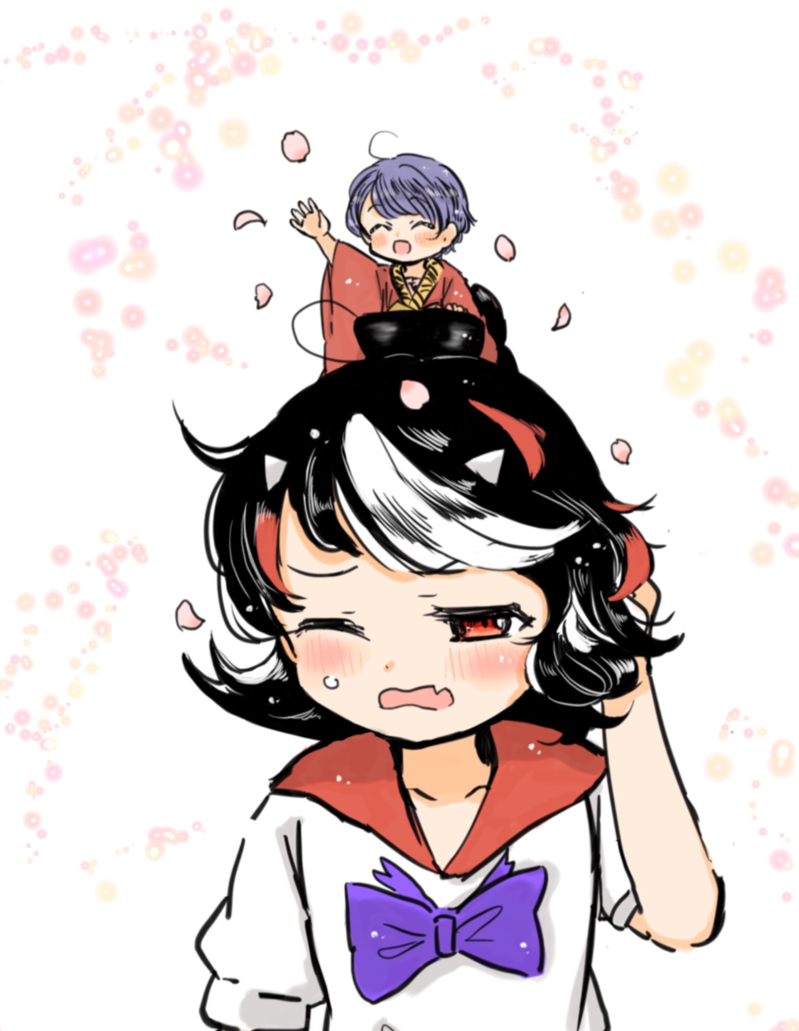 2girls ahoge black_hair blush bow bowl bowtie closed_eyes collarbone commentary cone_horns fang grey_horns highres horns japanese_clothes kijin_seija kimono looking_at_viewer multicolored_hair multiple_girls on_head one_eye_closed open_mouth petals purple_bow purple_bowtie red_hair red_kimono rin_tarou short_sleeves skin_fang small_horns streaked_hair sukuna_shinmyoumaru sweatdrop untranslatable_commentary touhou upper_body white_background white_hair